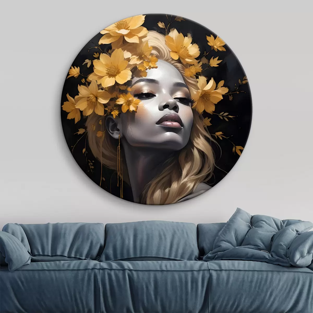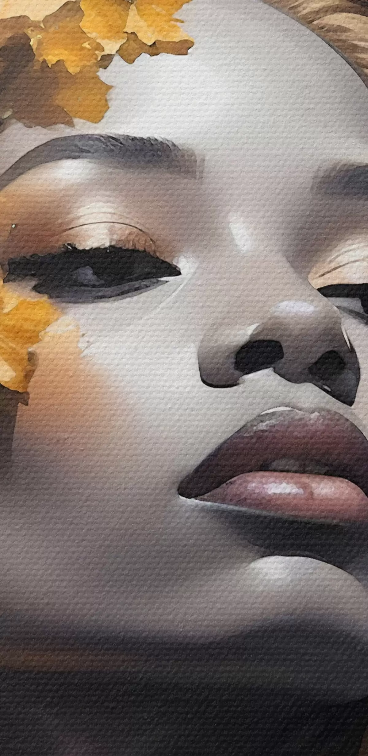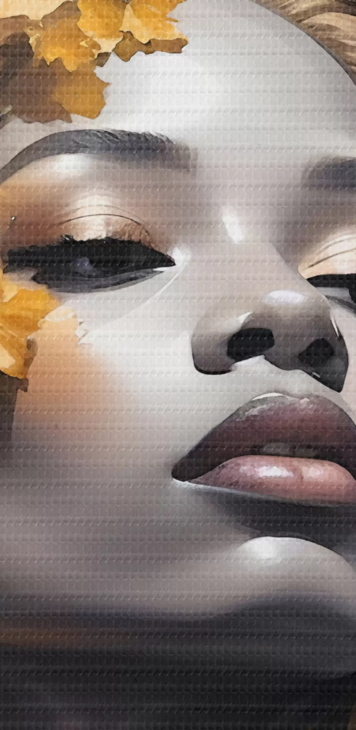 Kép Fiatal nő portréja sárga őszi levelekkel körülvéve, sötét háttér előtt Nr r38834