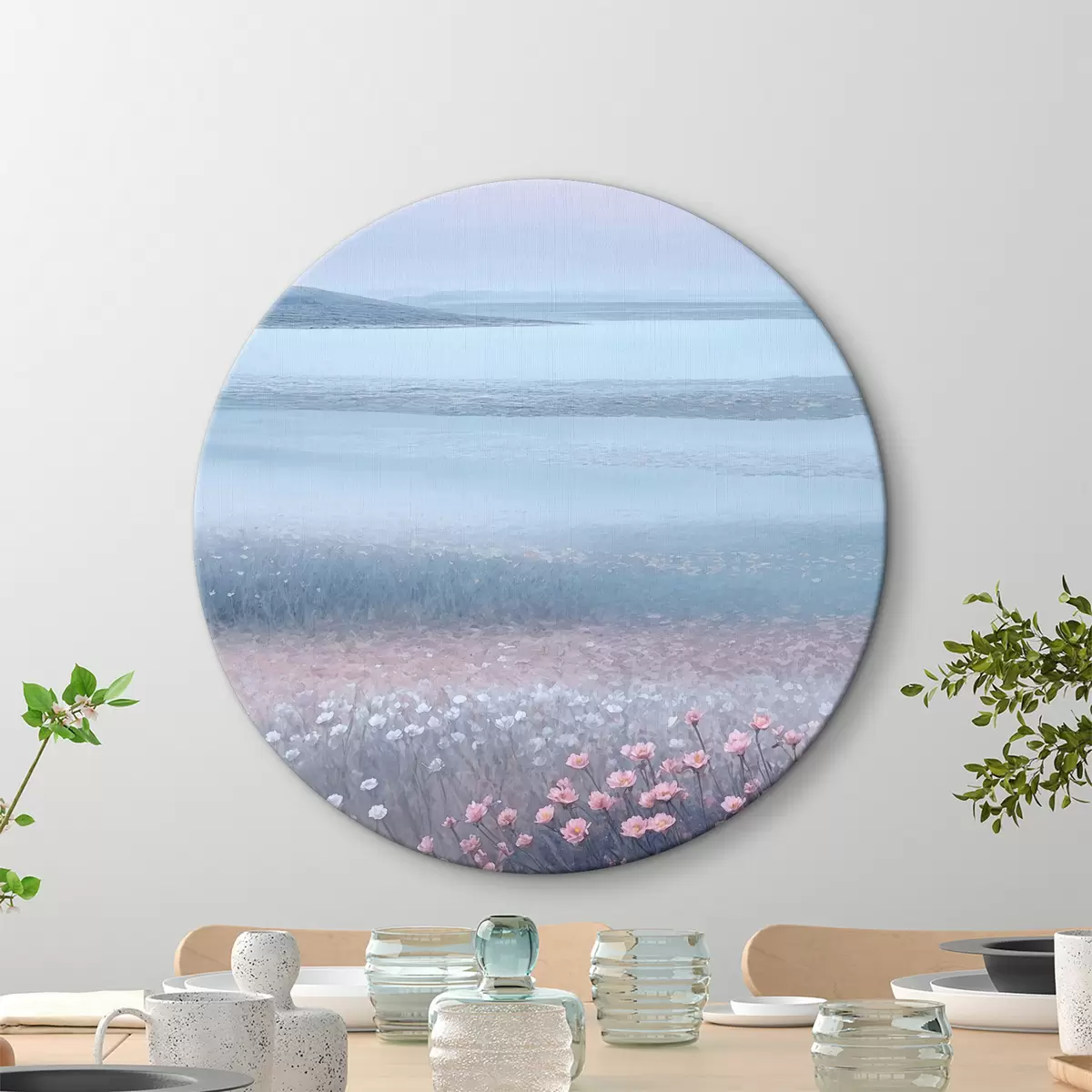 Kép Táj nyugodt mezővel, rózsaszín és fehér virágokkal, álomszerű hangulatú minimalista festészet Nr r38886