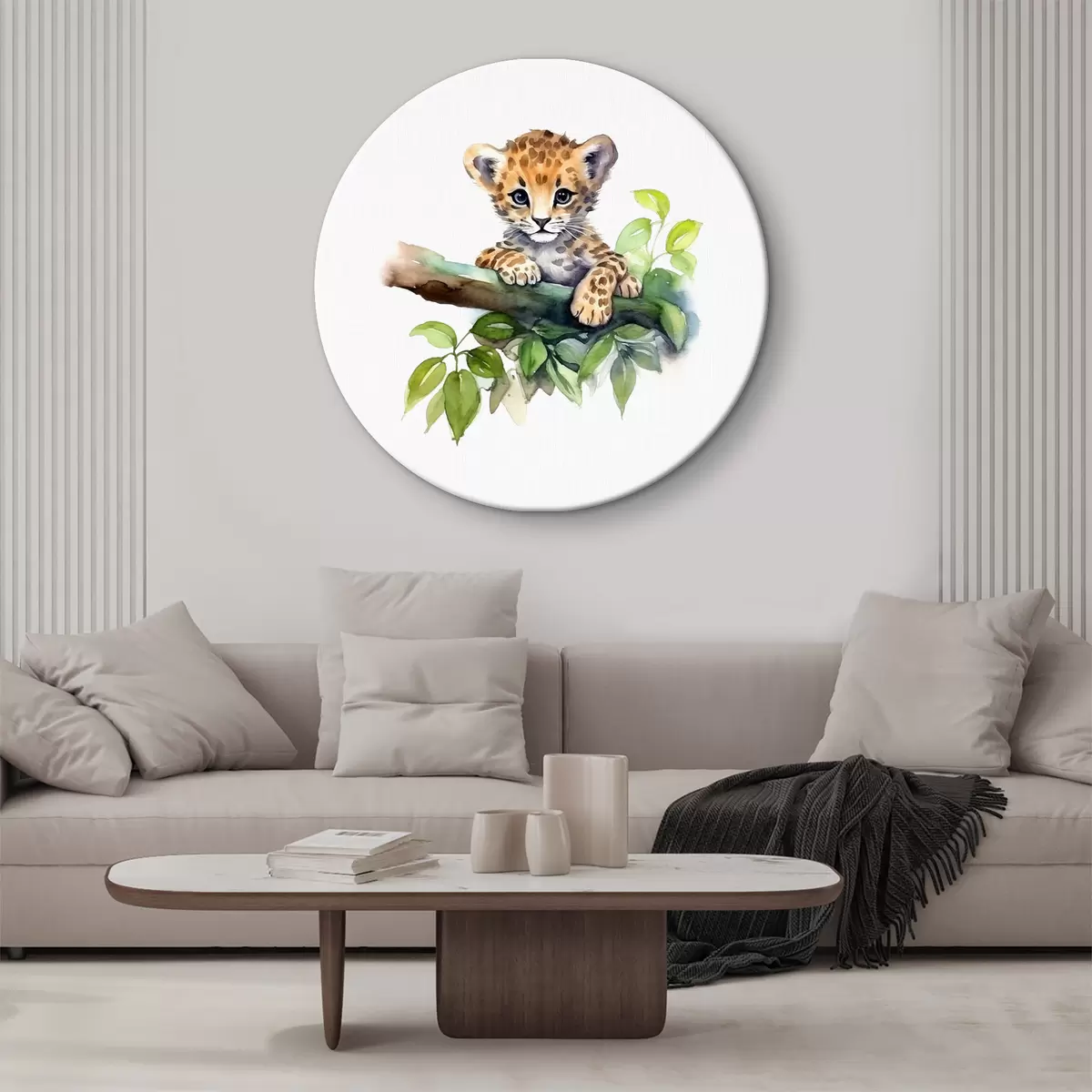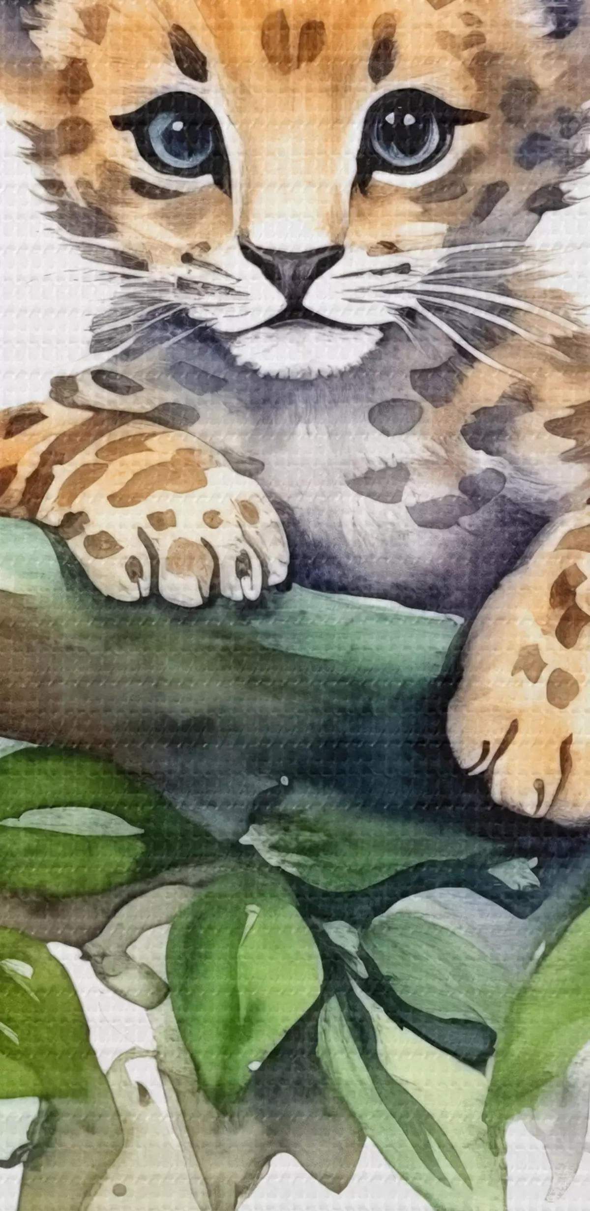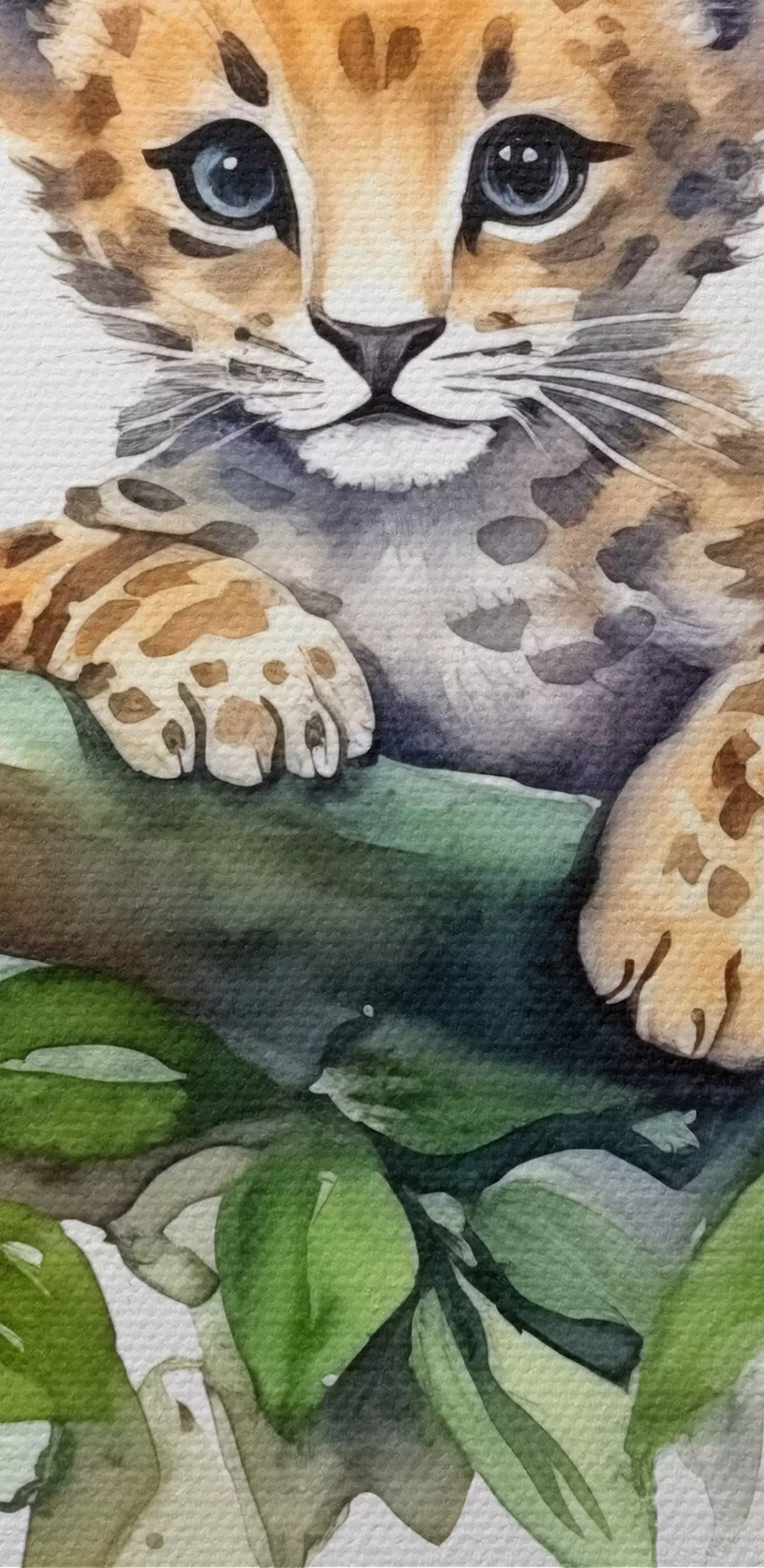 Kép Leopárdkölyök ül egy ágon, zöld levelekkel, állattal, akvarell Nr r38922