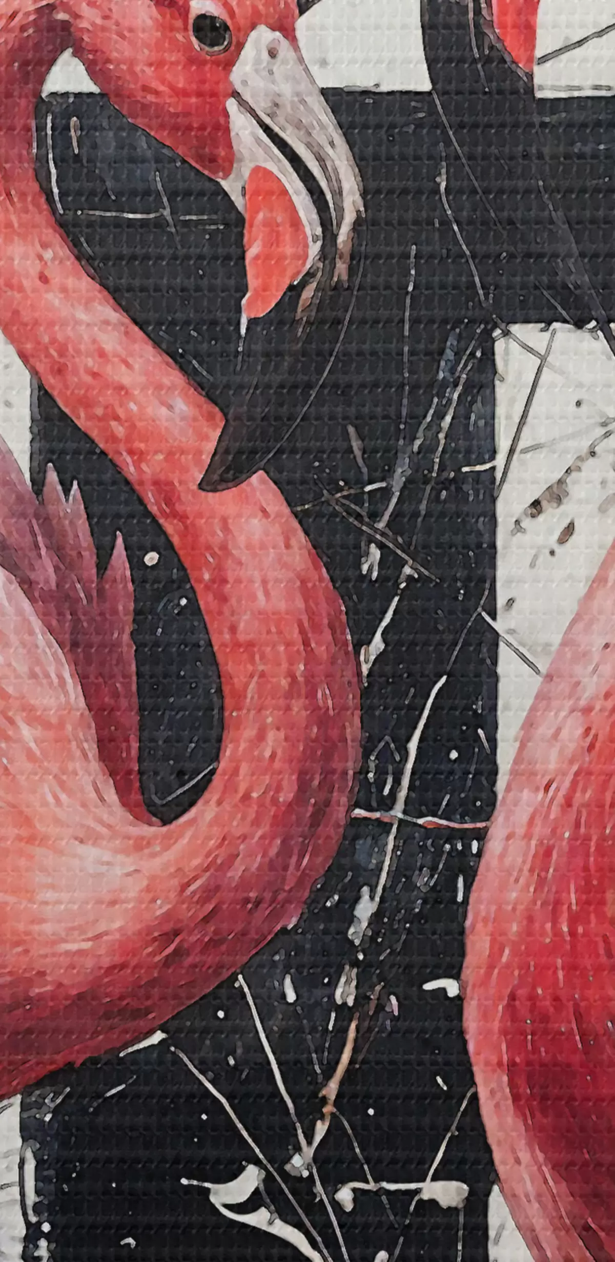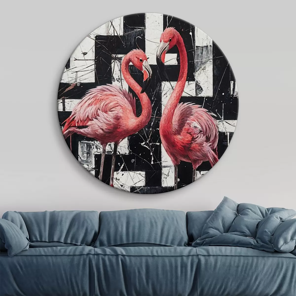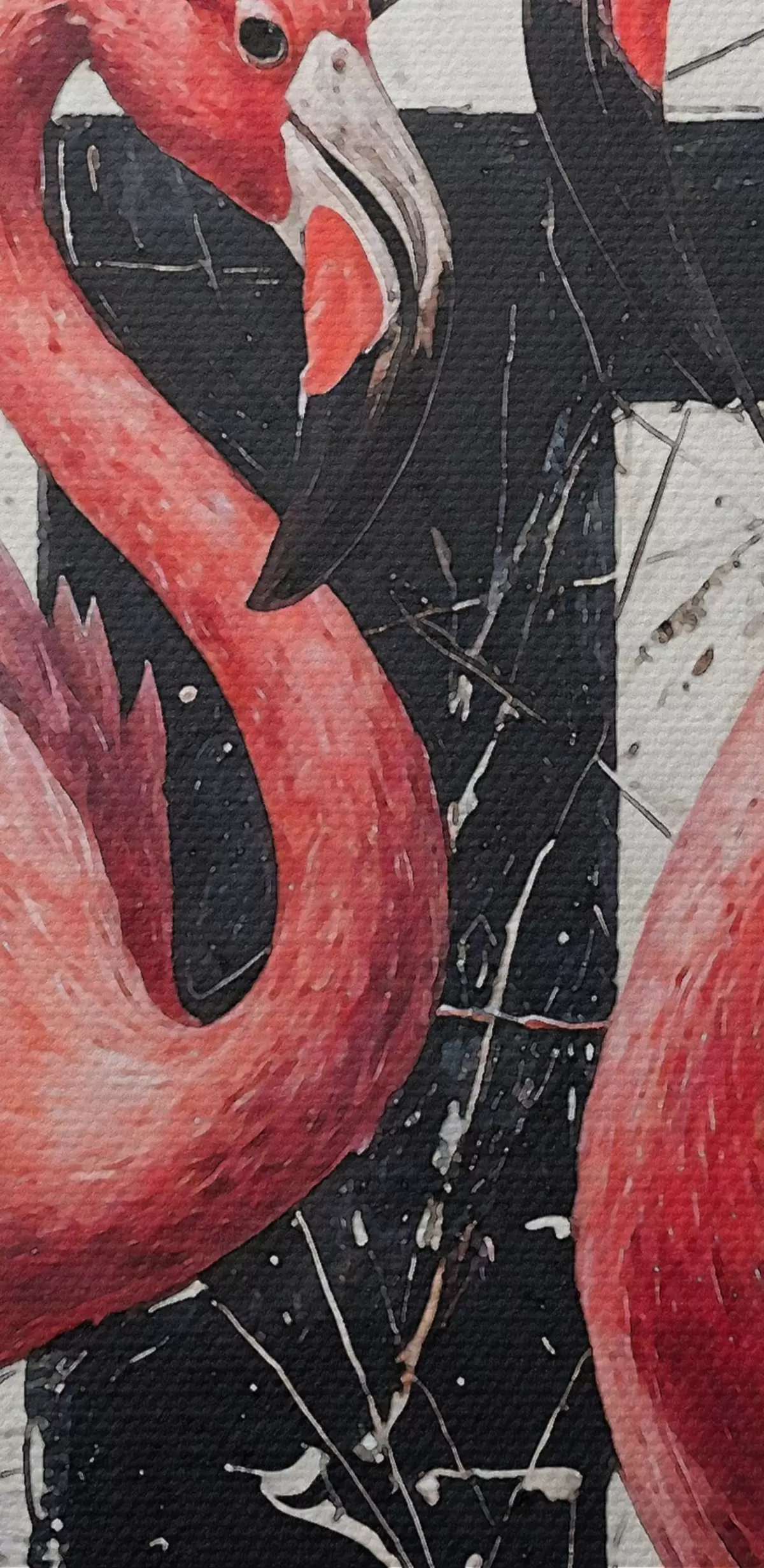 Kép Két rózsaszín flamingó áll egy fekete-fehér absztrakt háttér művészeti festmény előtt Nr r38954
