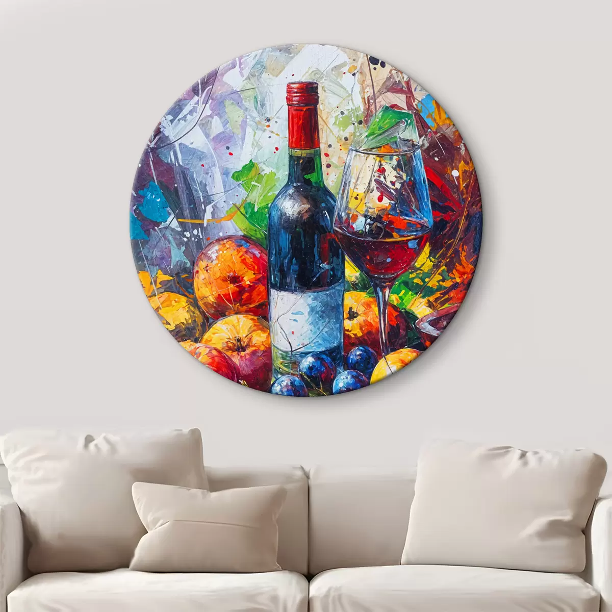 Kép Absztrakt csendélet festmény egy üveg borról, egy pohár borról és színes gyümölcsökről, különböző színű fröccsökkel Nr r38958