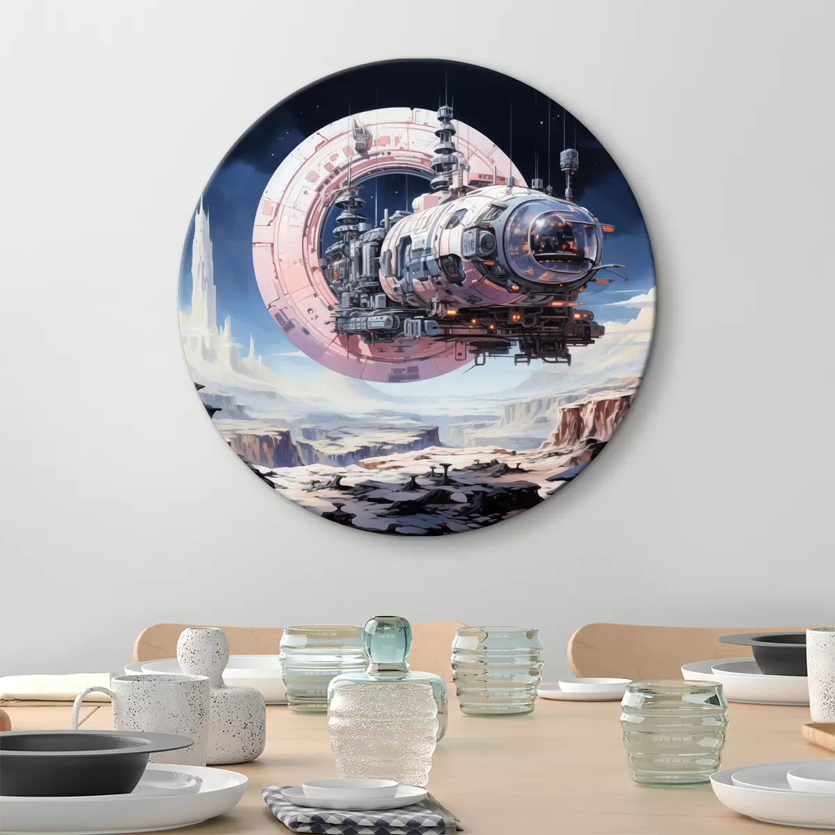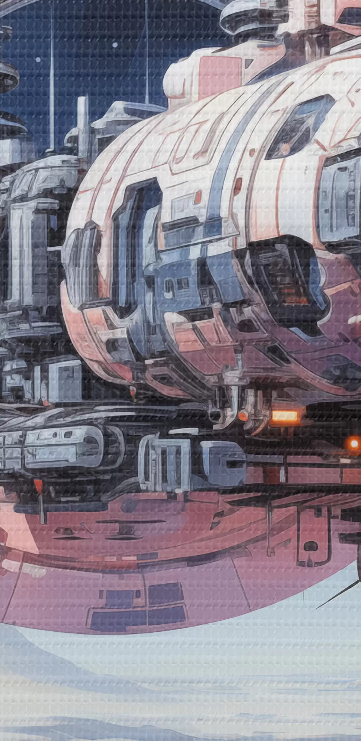 Kép Egy cyberpunk stílusú űrhajó repül az űrben egy aszteroida és egy bolygó felett, kék, bézs, rózsaszín, fehér színben Nr r39115