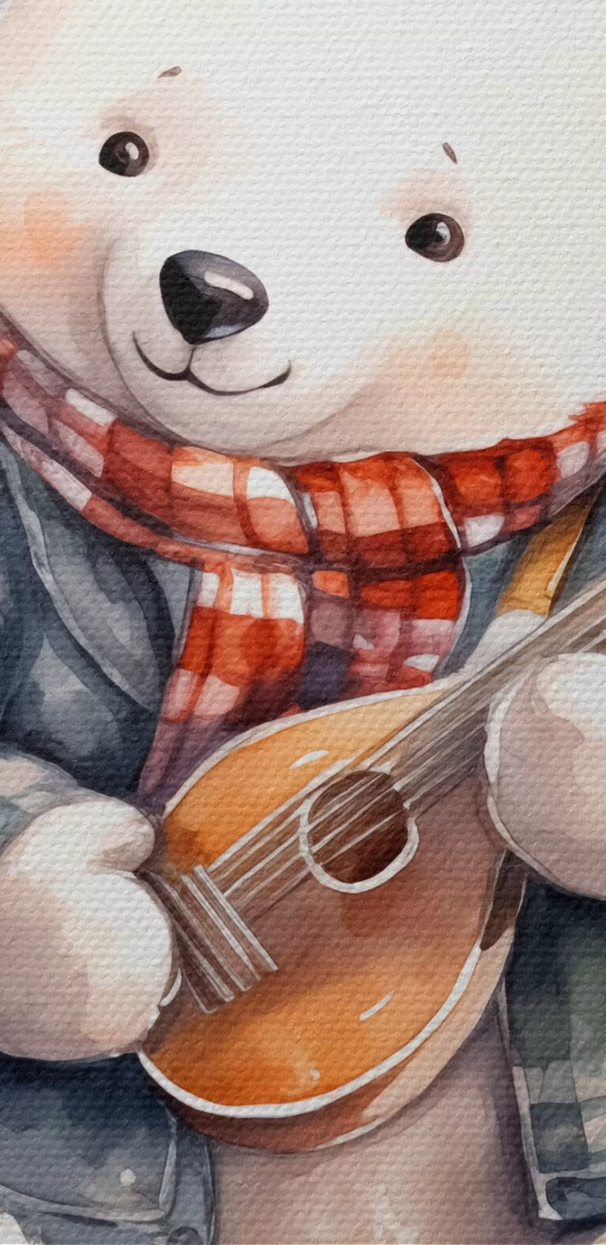 Kép Jegesmedve zenész kék kockás öltönyben, piros sállal gitározik a gyerekek akvarell illusztrációján Nr r39120