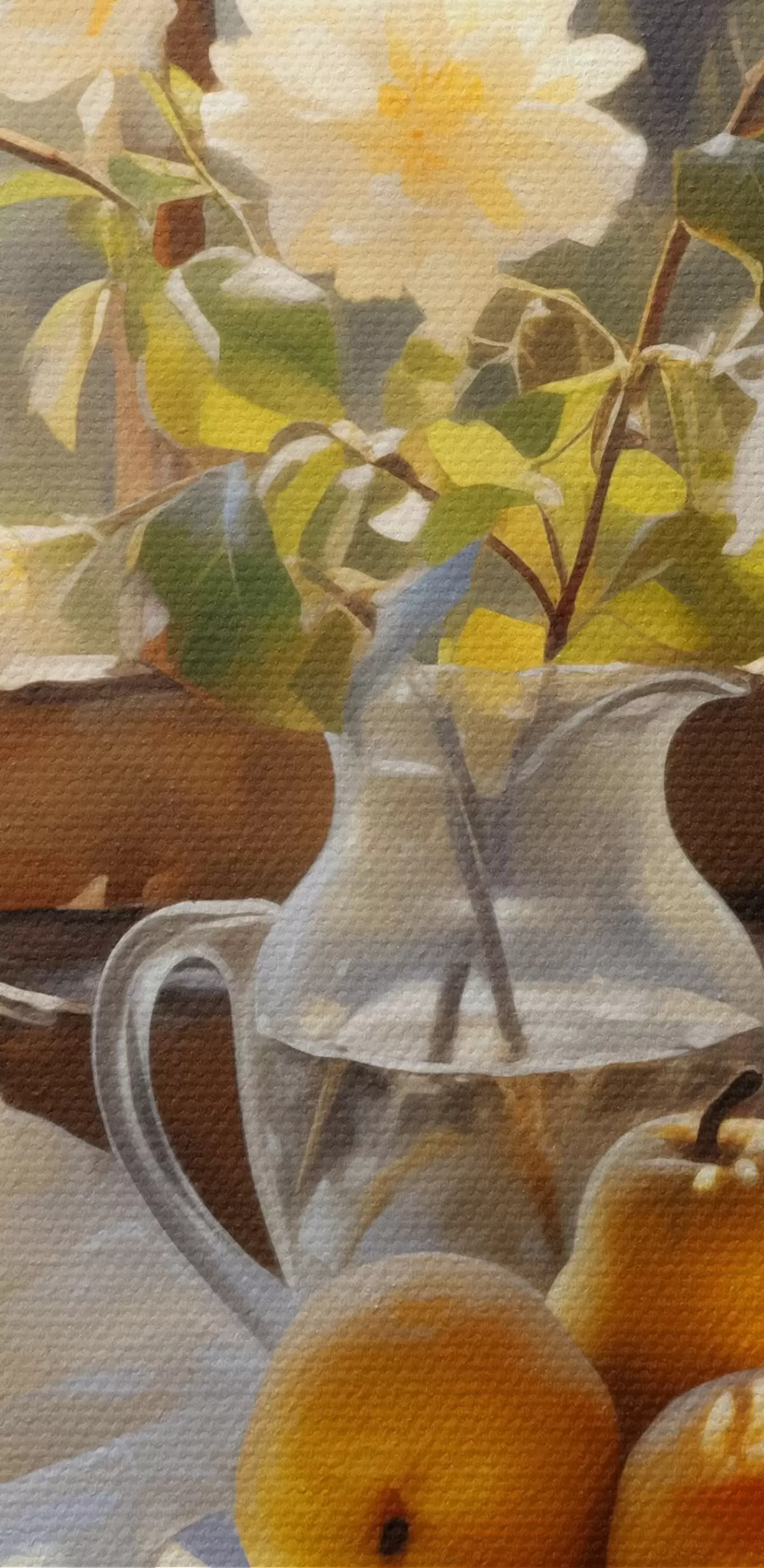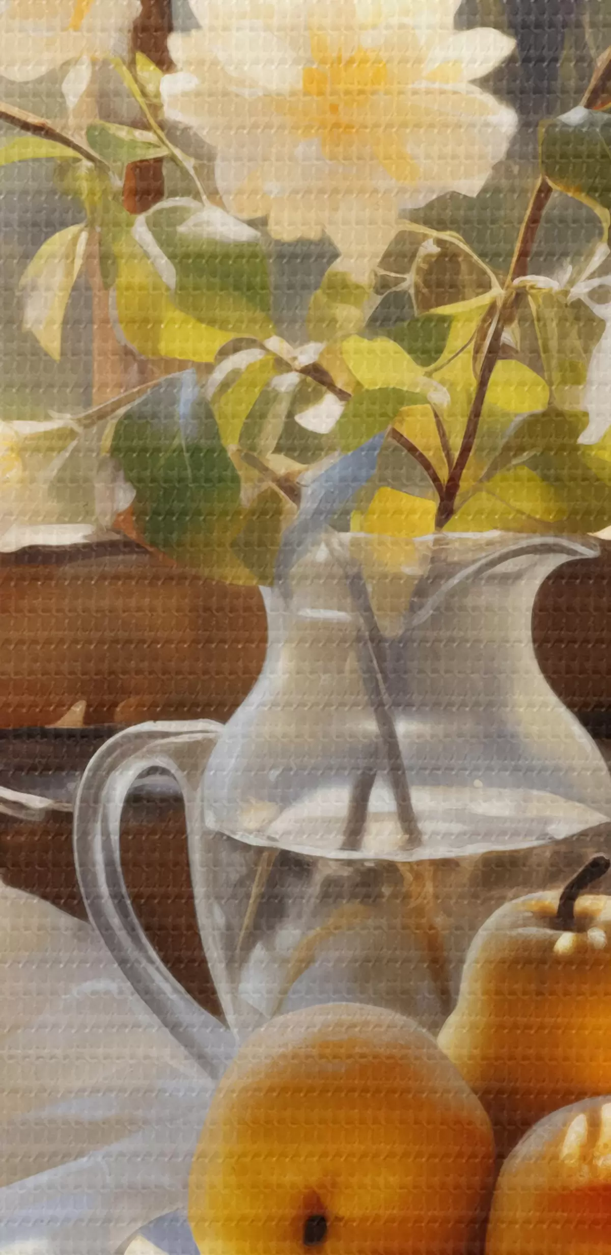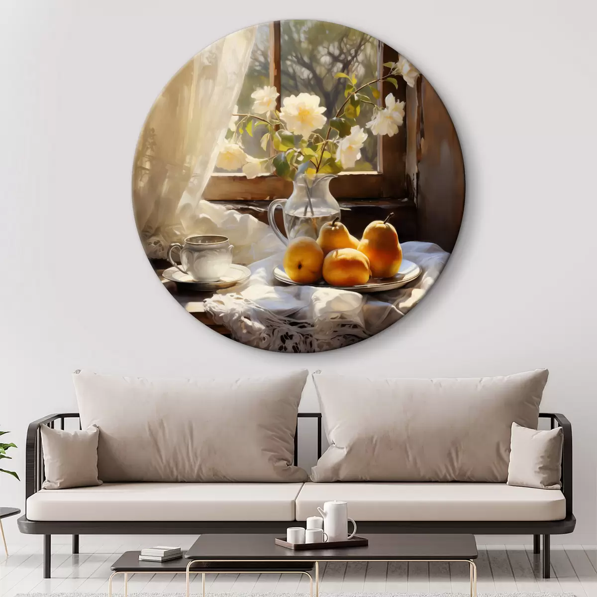 Kép Rusztikus csendélet sárga, érett körte tányéron az ablak melletti asztalon, fehér rózsák üvegkancsóban, fehér csipkefüggöny Nr r39129