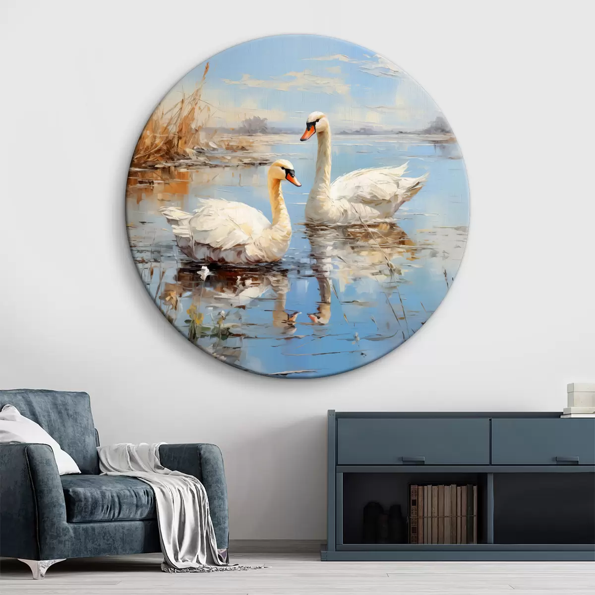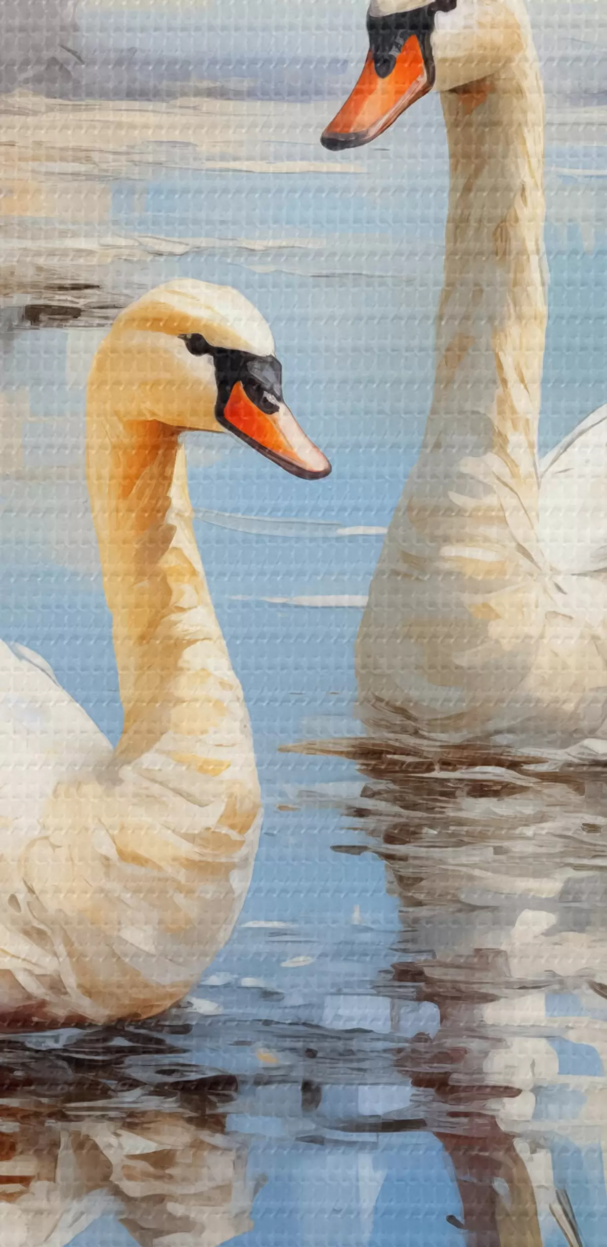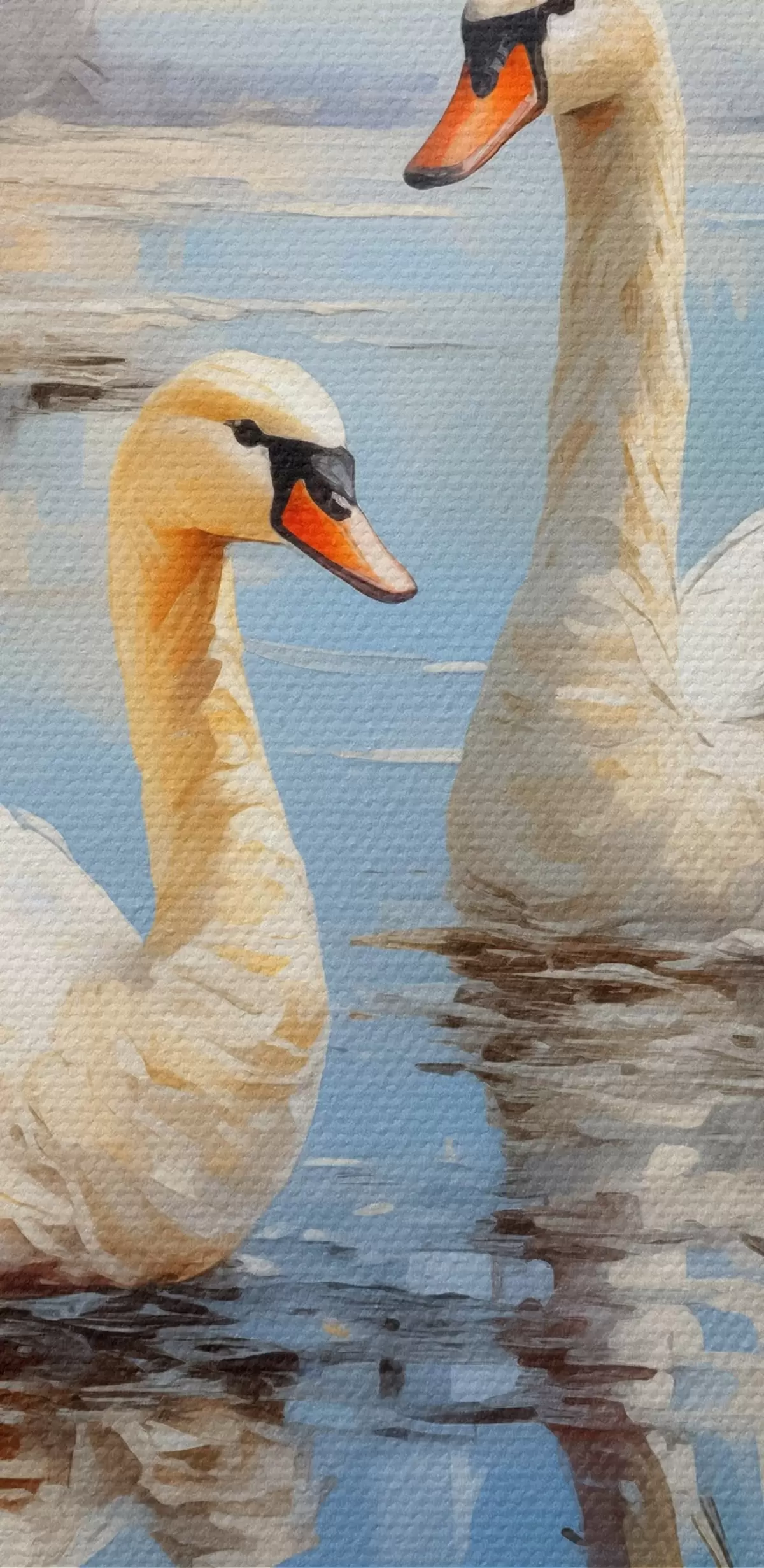 Kép Fehér libák úsznak a folyó mentén a nádasok között, kék, fehér, bézs színűek Nr r39130