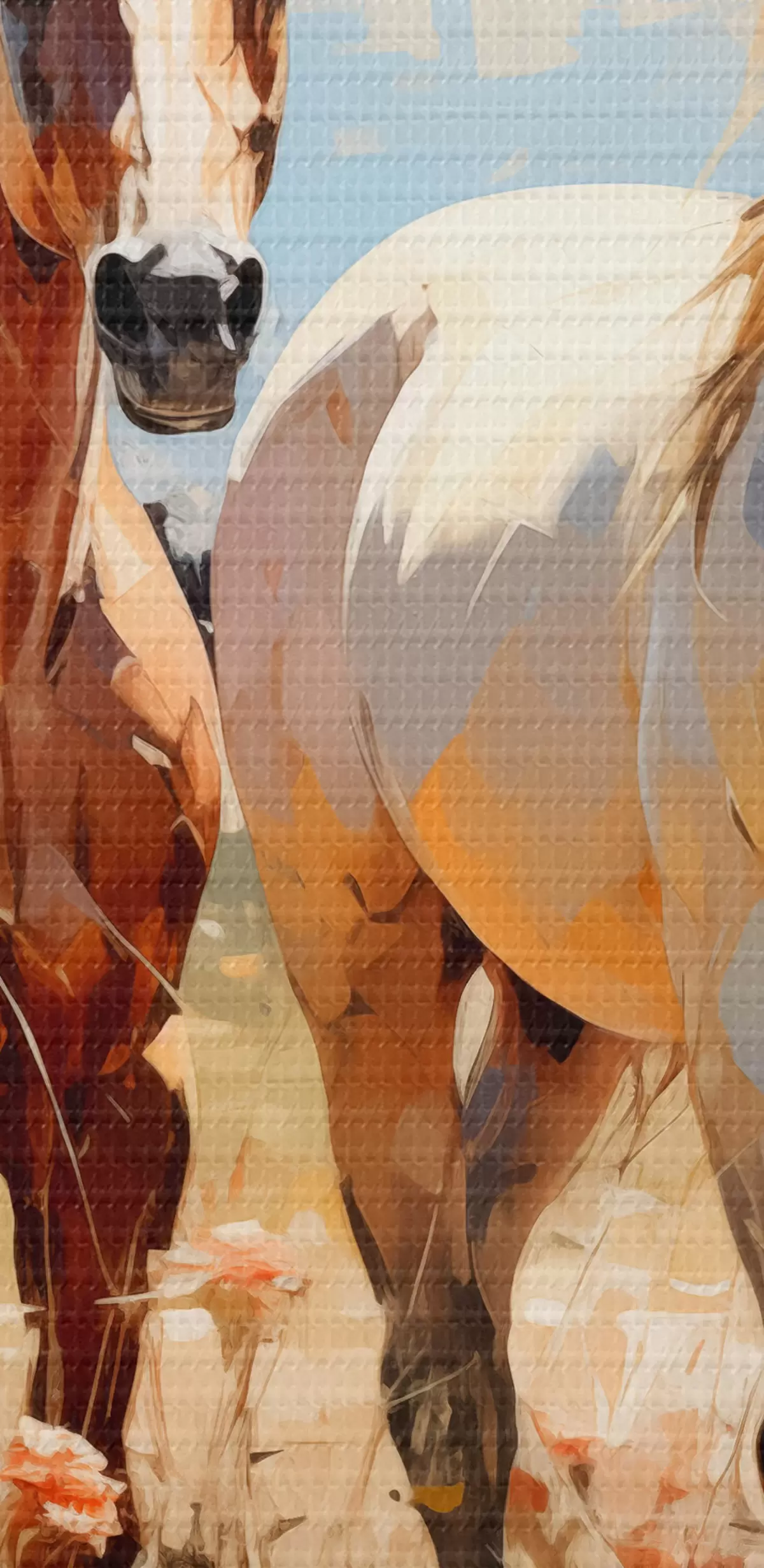 Kép Fehér és barna lovak legelnek a réten a vadvirágok között olajfestmény absztrakt művészet Nr r39187