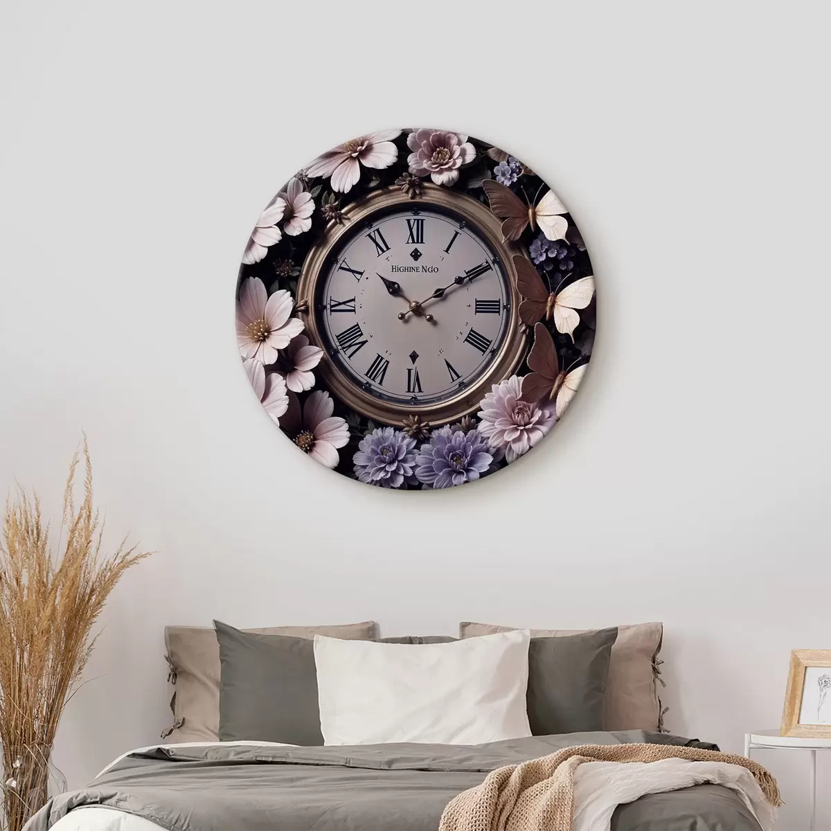 Kép Egy antik óra gyönyörű lila és rózsaszín virágokkal körülvéve, sötét háttér előtt Nr r39386