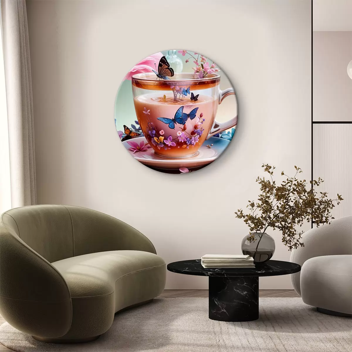 Kép Egy csésze tea rózsaszín és kék virágokkal körülvéve, körülötte repülő pillangók Nr r39388