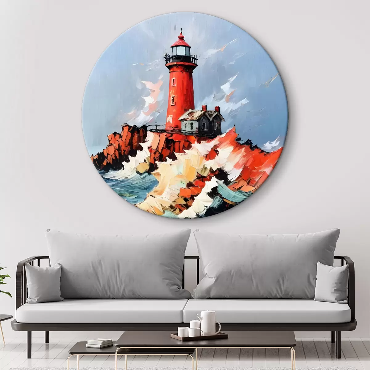Kép Festmény egy vörös világítótoronyról, amely magasan áll egy sziklás sziklán, összecsapó hullámokkal és viharos égbolttal körülvéve Nr r39392