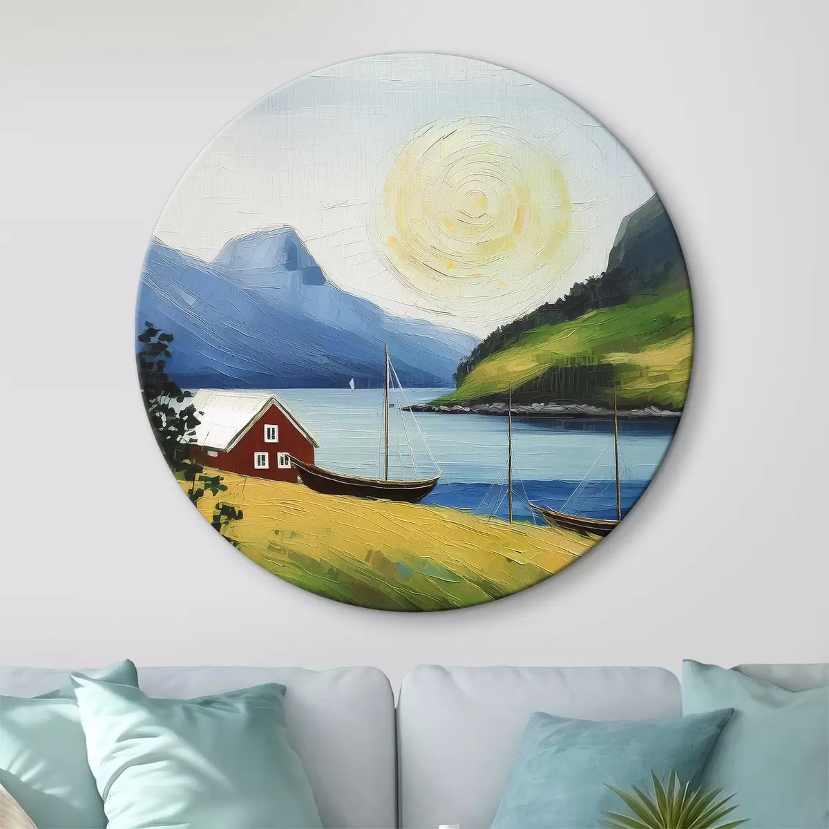 Kép Északi nyár, kis ház a tenger partján, nap a kék égen, hegyek Nr r39423