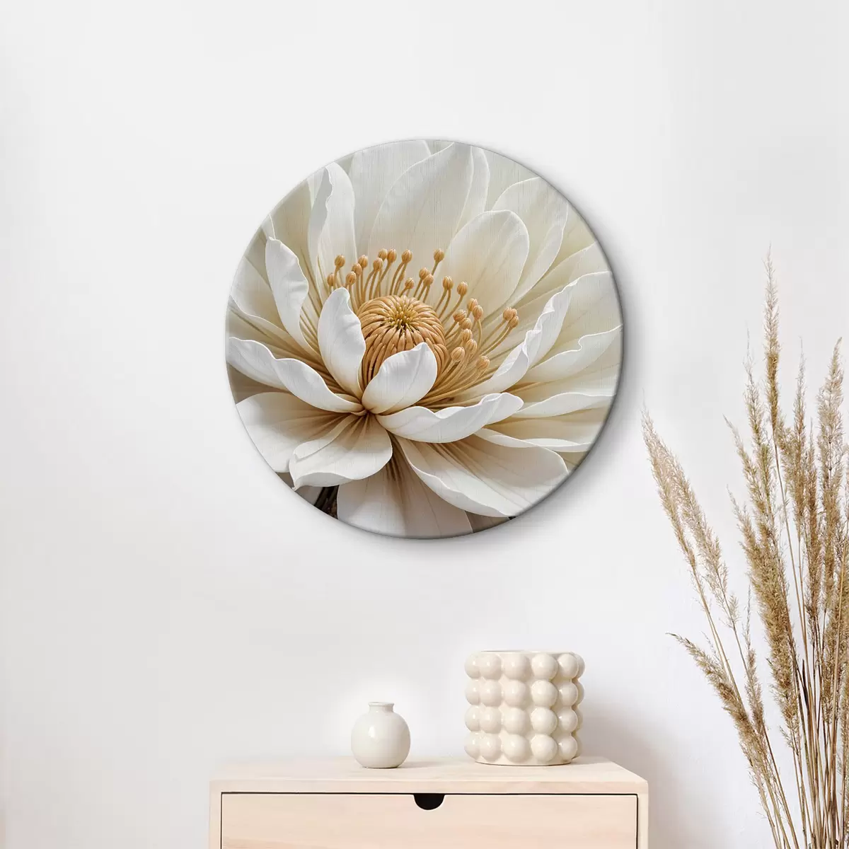 Kerek festmények Közeli kép egy nagy, fehér dália virágról, finom szirmokkal és élénk sárga közepével r39508