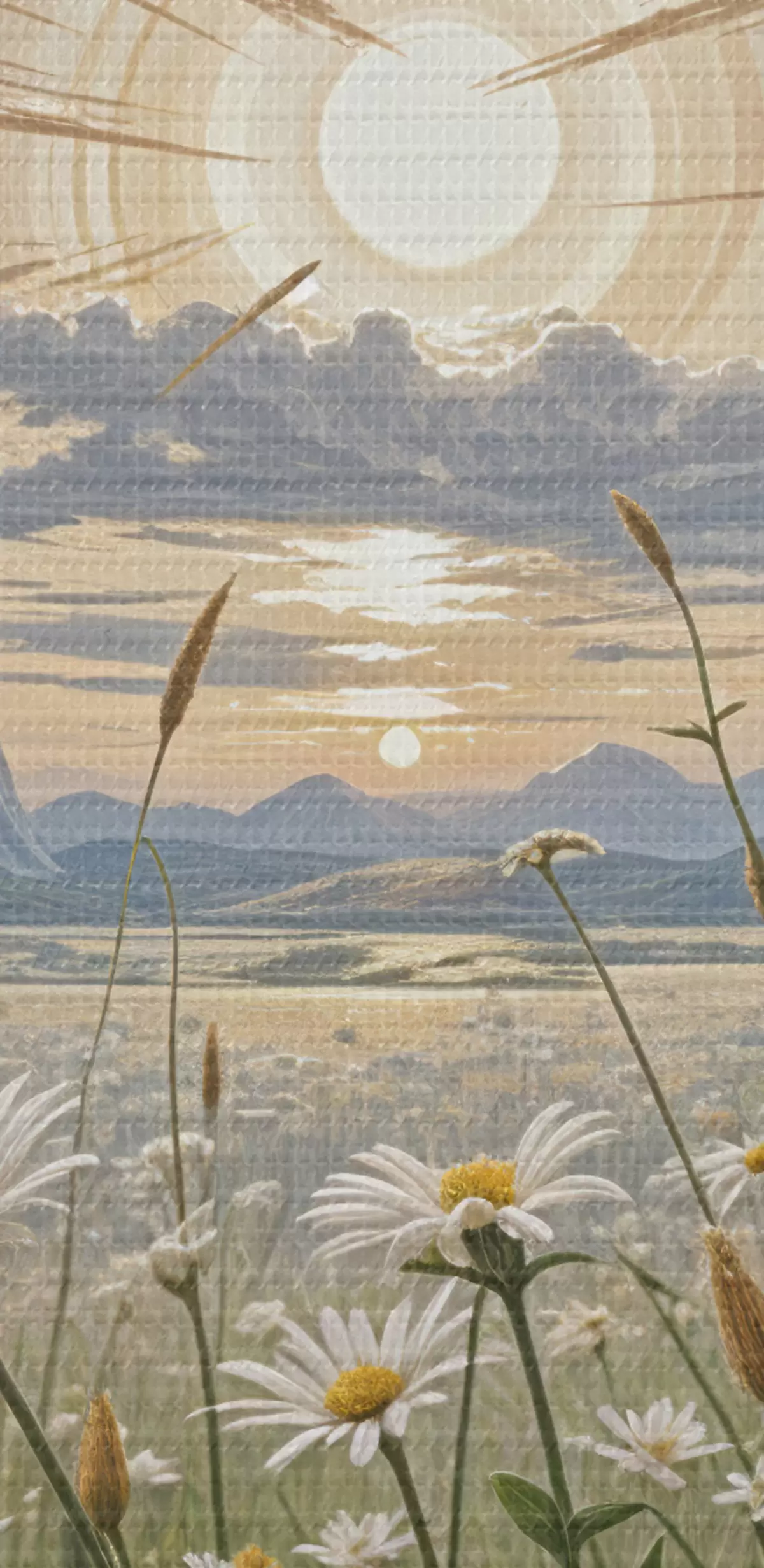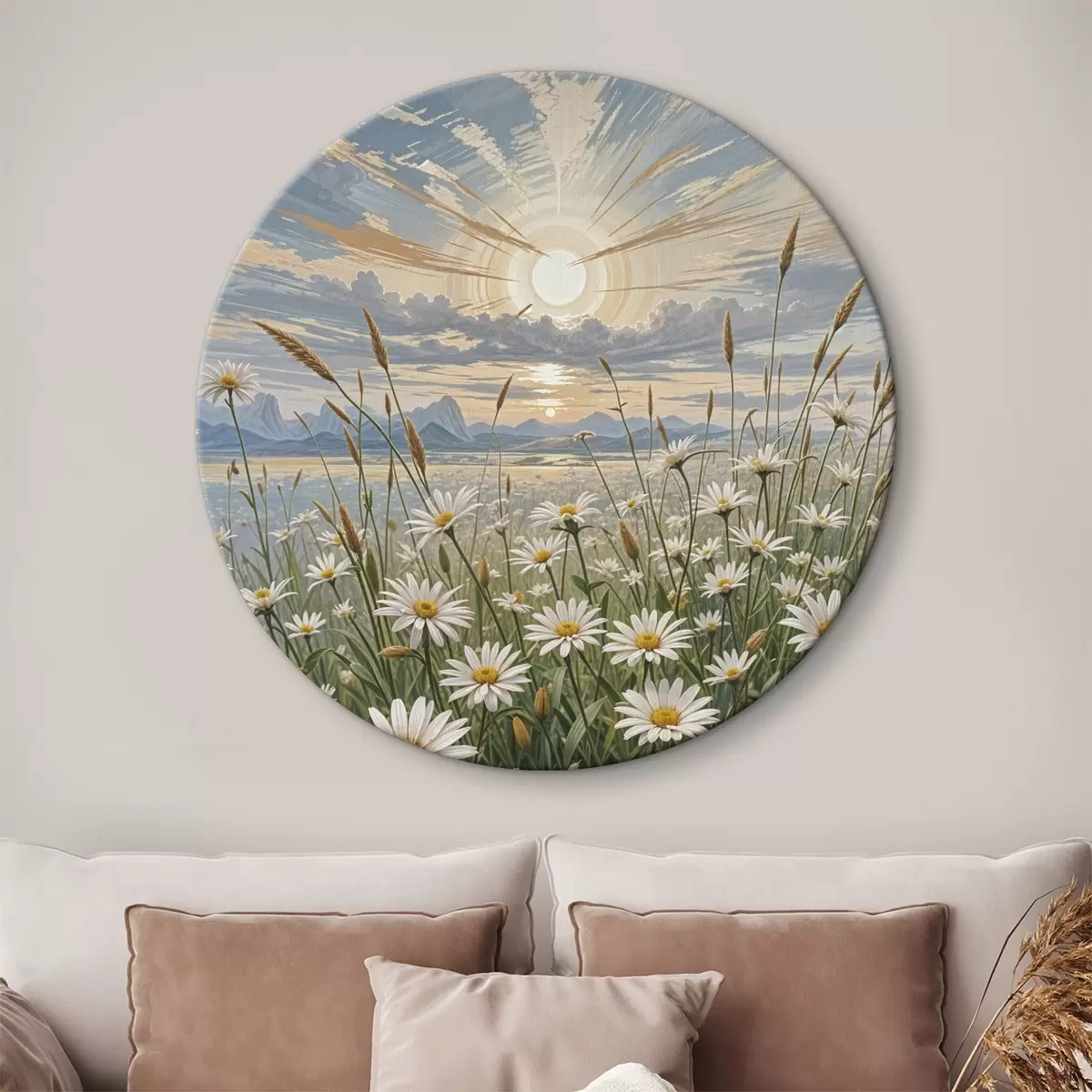 Kép Fehér százszorszép virágok mezője az előtérben, hegyi tájjal és felhős égbolttal Nr r39528