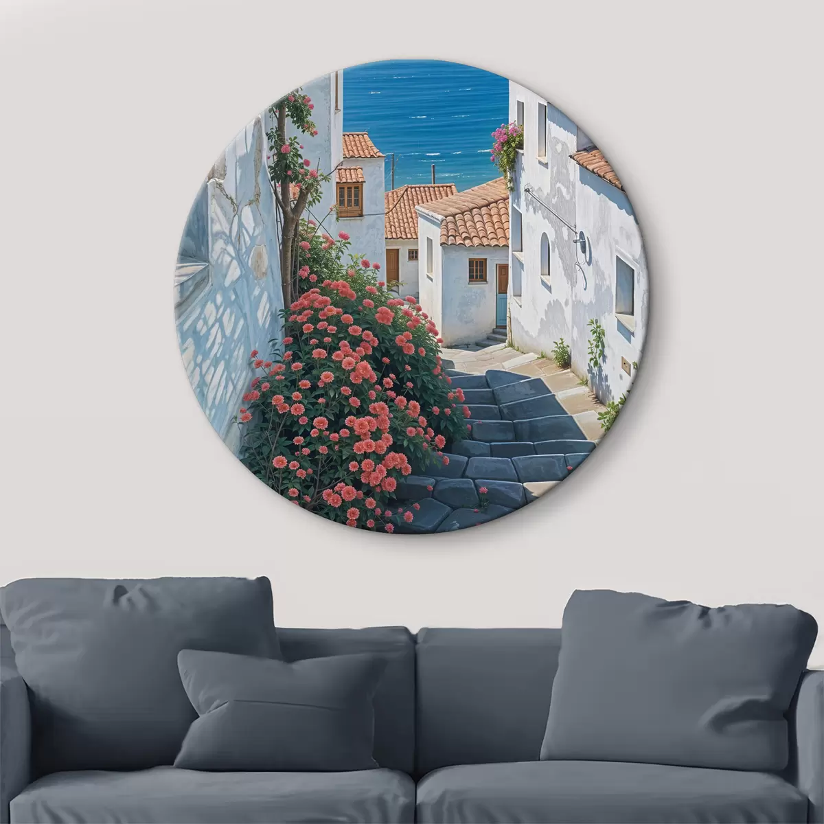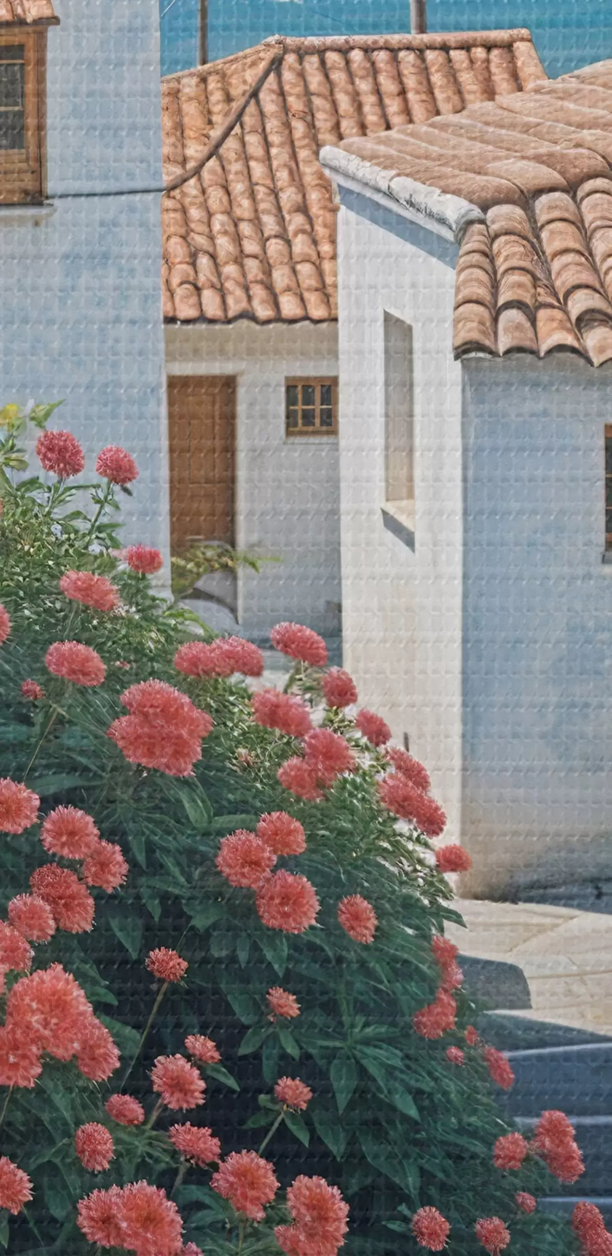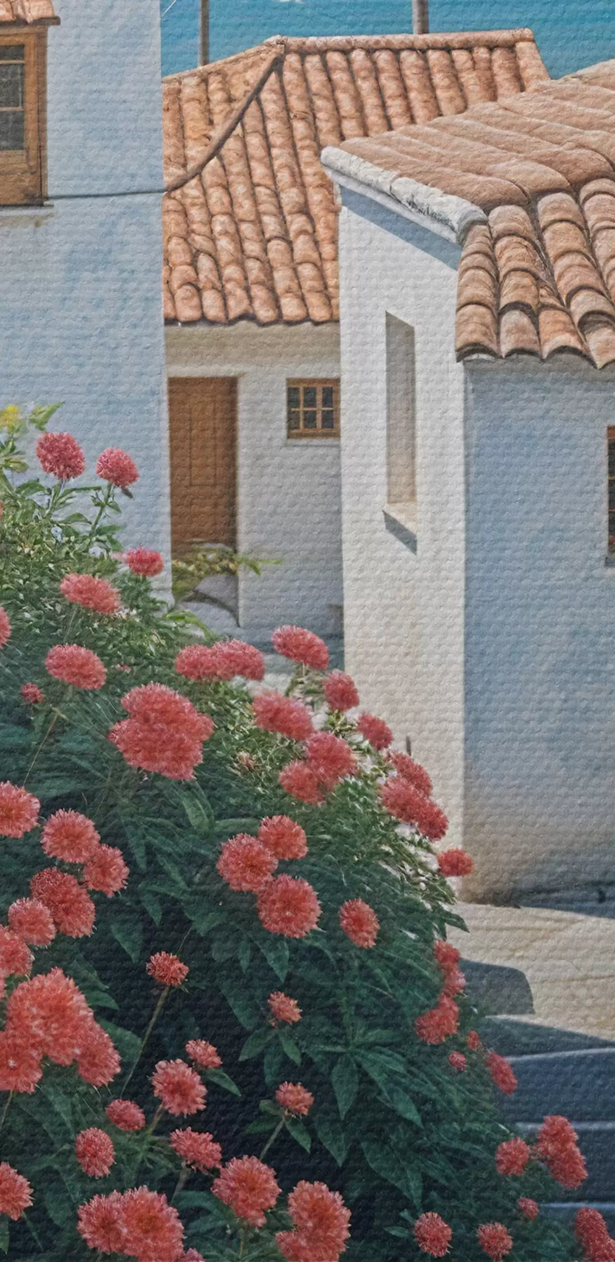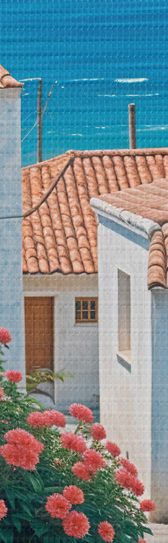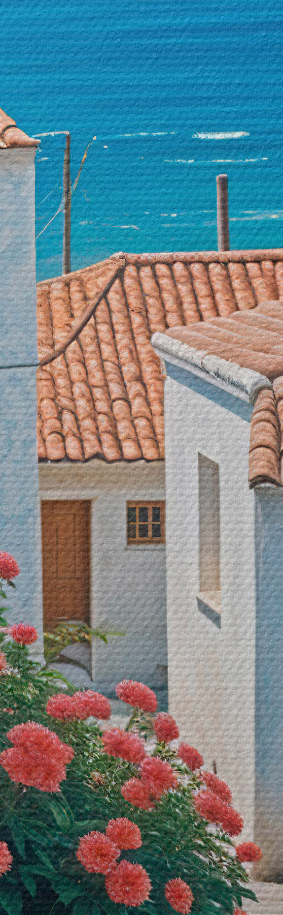 Kép Egy keskeny utca egy tengerparti városban, fehér épületekkel, piros cseréptetőkkel és élénk rózsaszín virágokkal Nr r39532