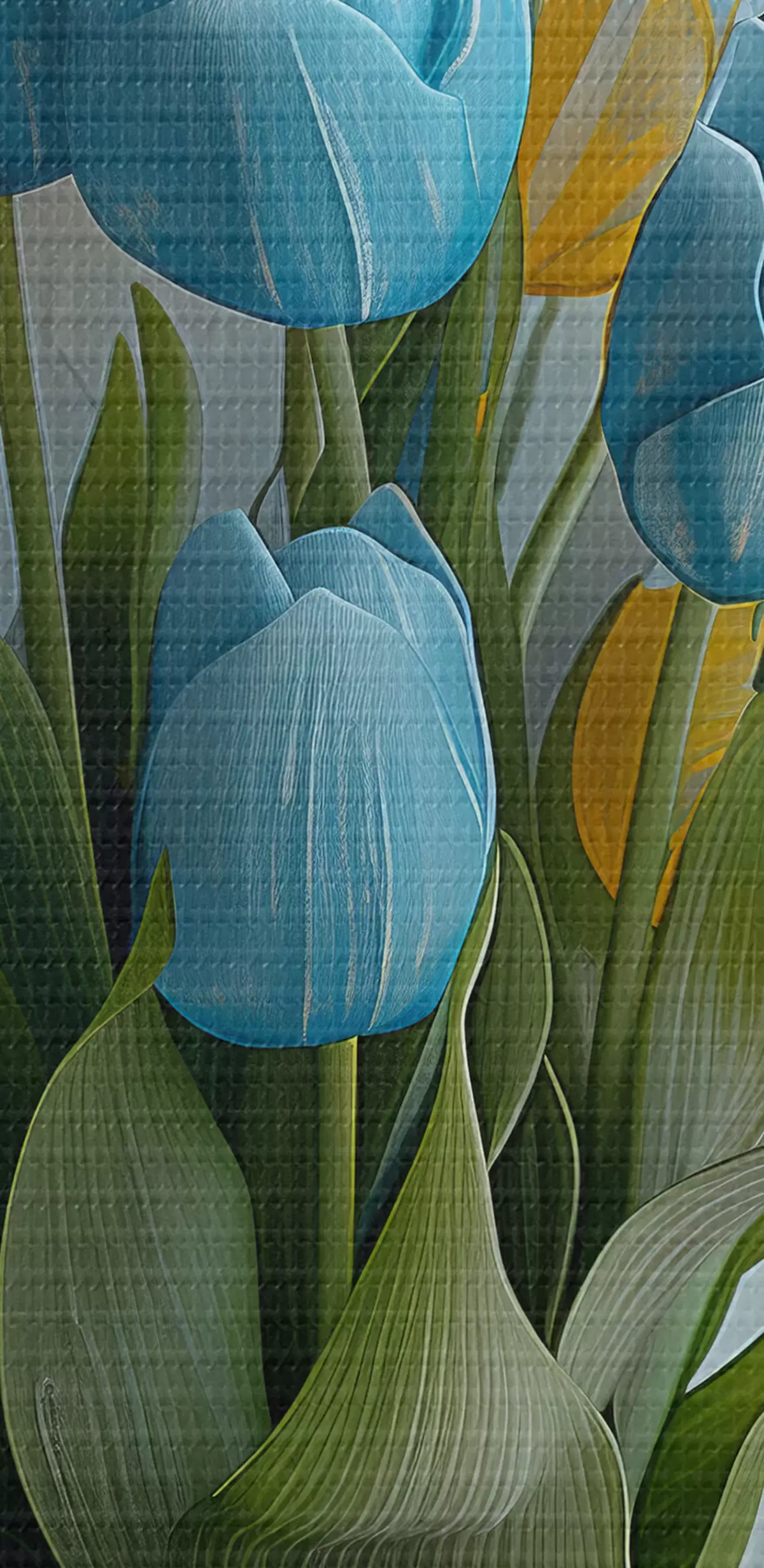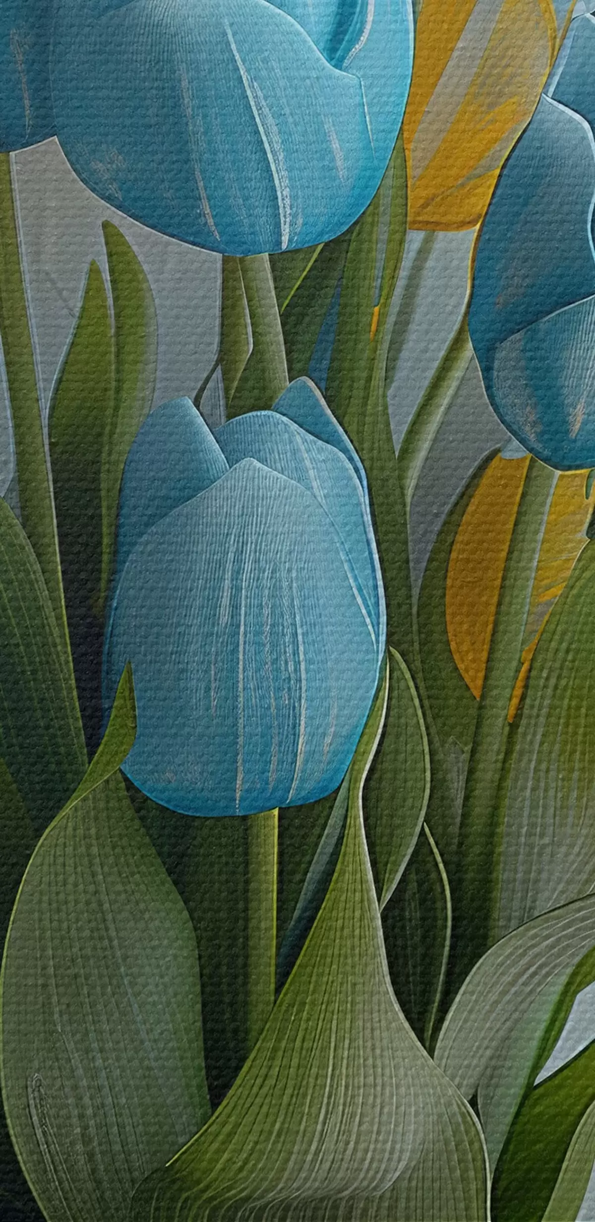 Kép Kék és sárga tulipánok 3D-ben: elegáns fali kép fehér kerettel, fehér és világoskék háttérrel, gravírozott vázával Nr r39636