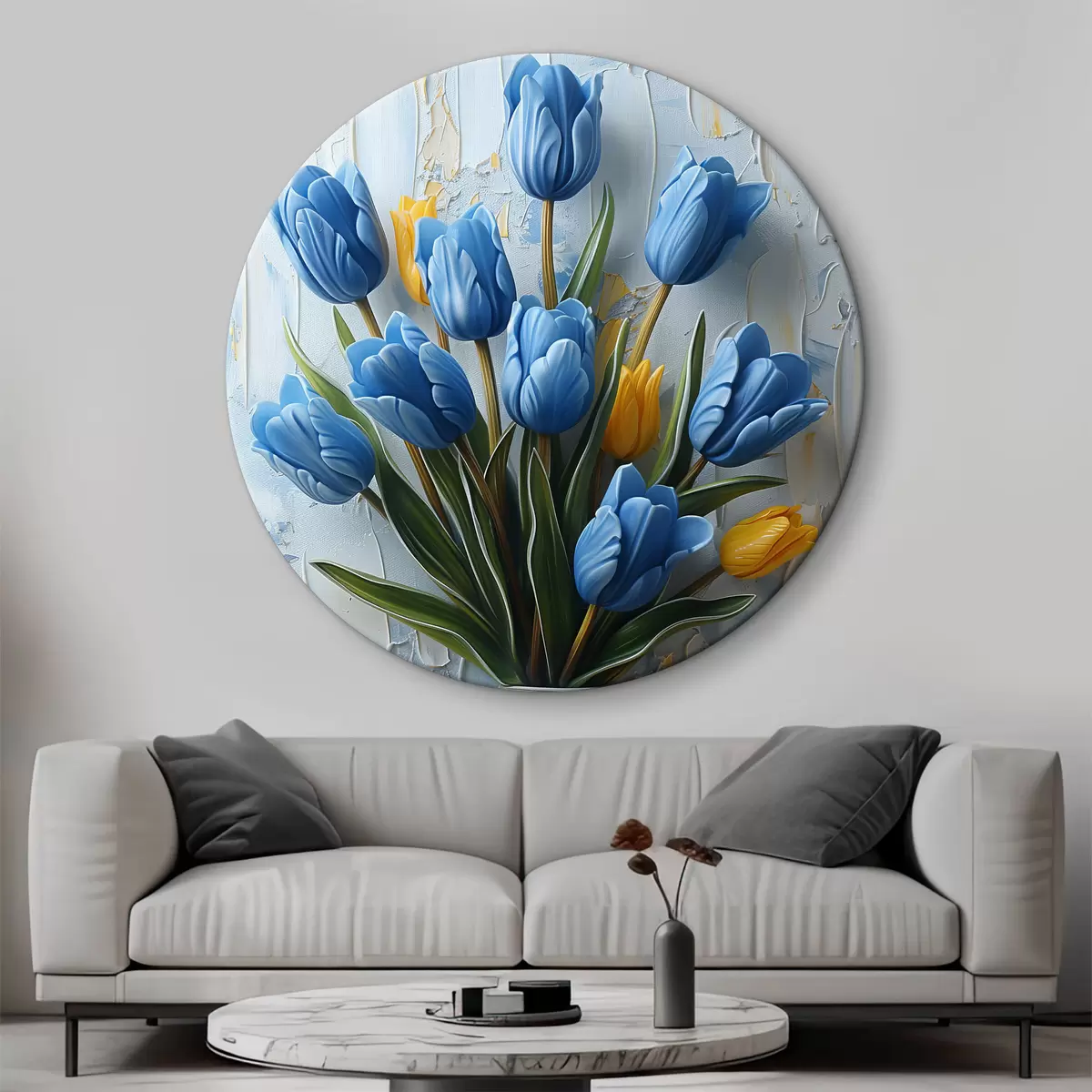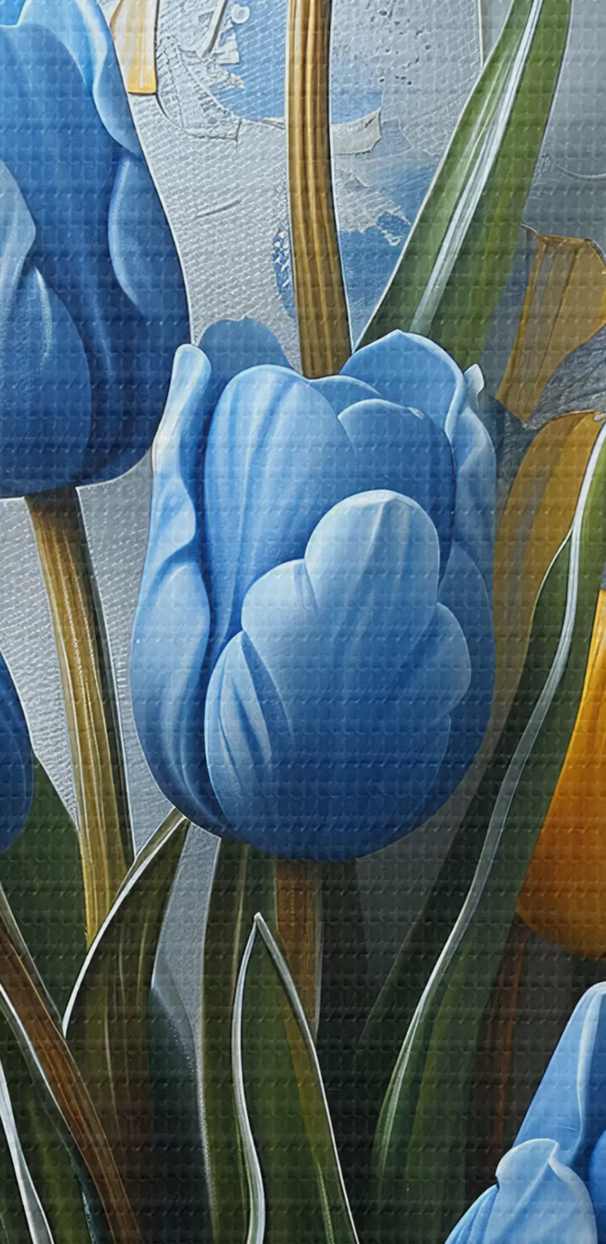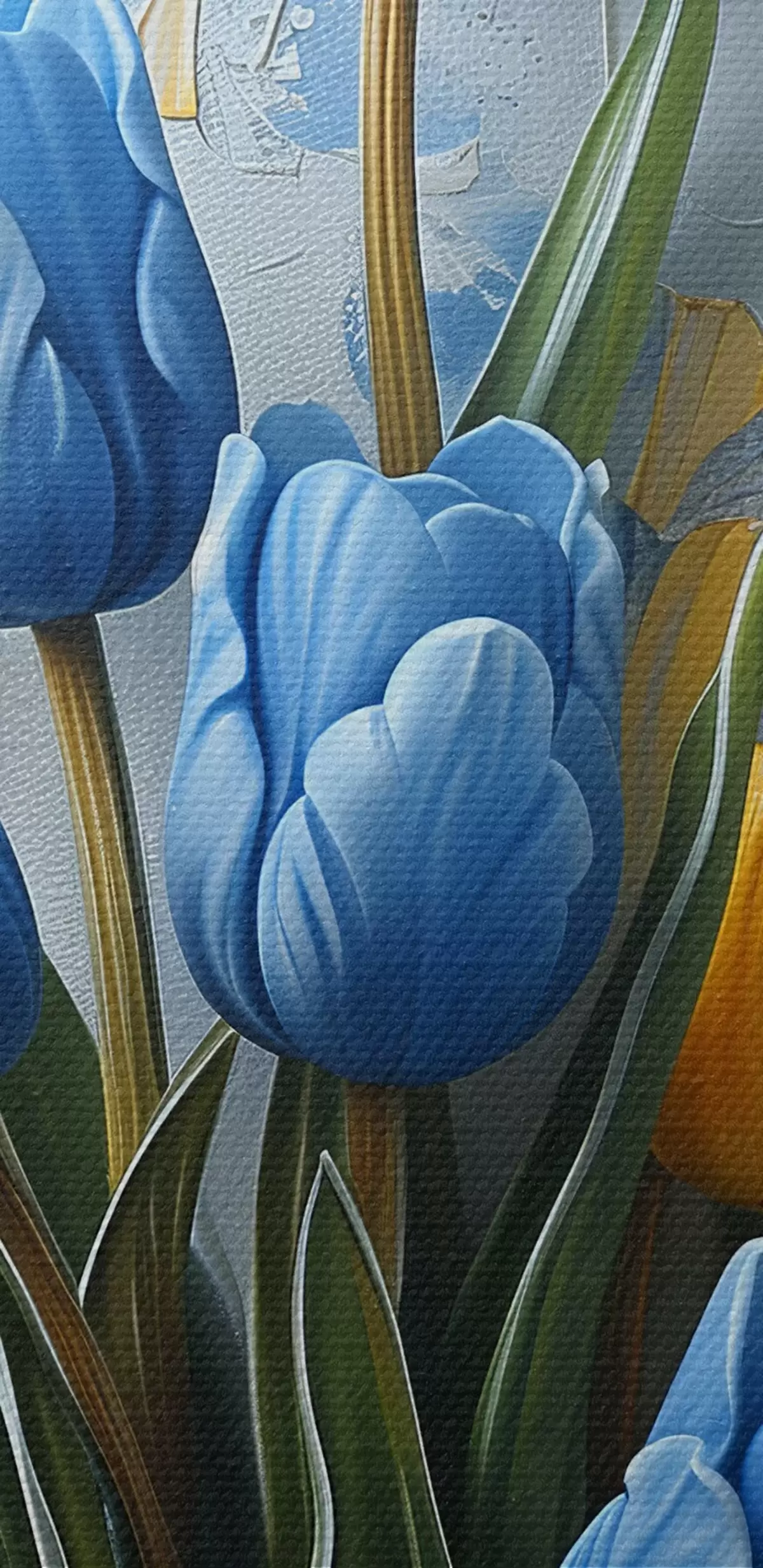 Kép Kék és sárga tulipánok 3D-ben: elegáns olajfestésű falikép fehér és világoskék háttérrel, gravírozott vázával Nr r39637
