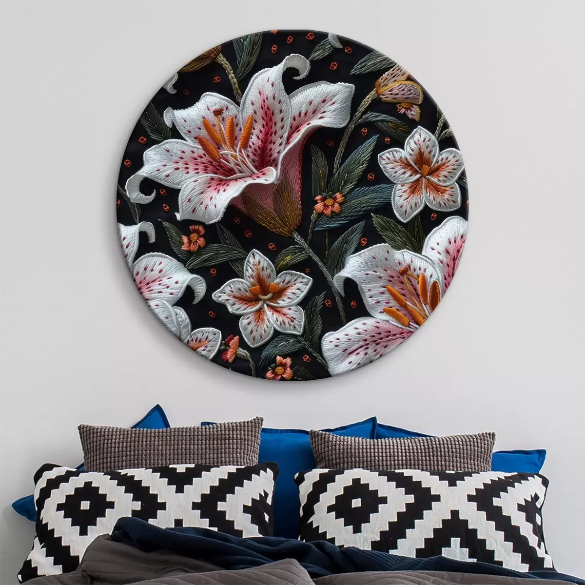 Kép Stumpwork hímzés: virágzó liliomok fekete cérnával, díszes anyagon, kétszínű palettával Nr r39649