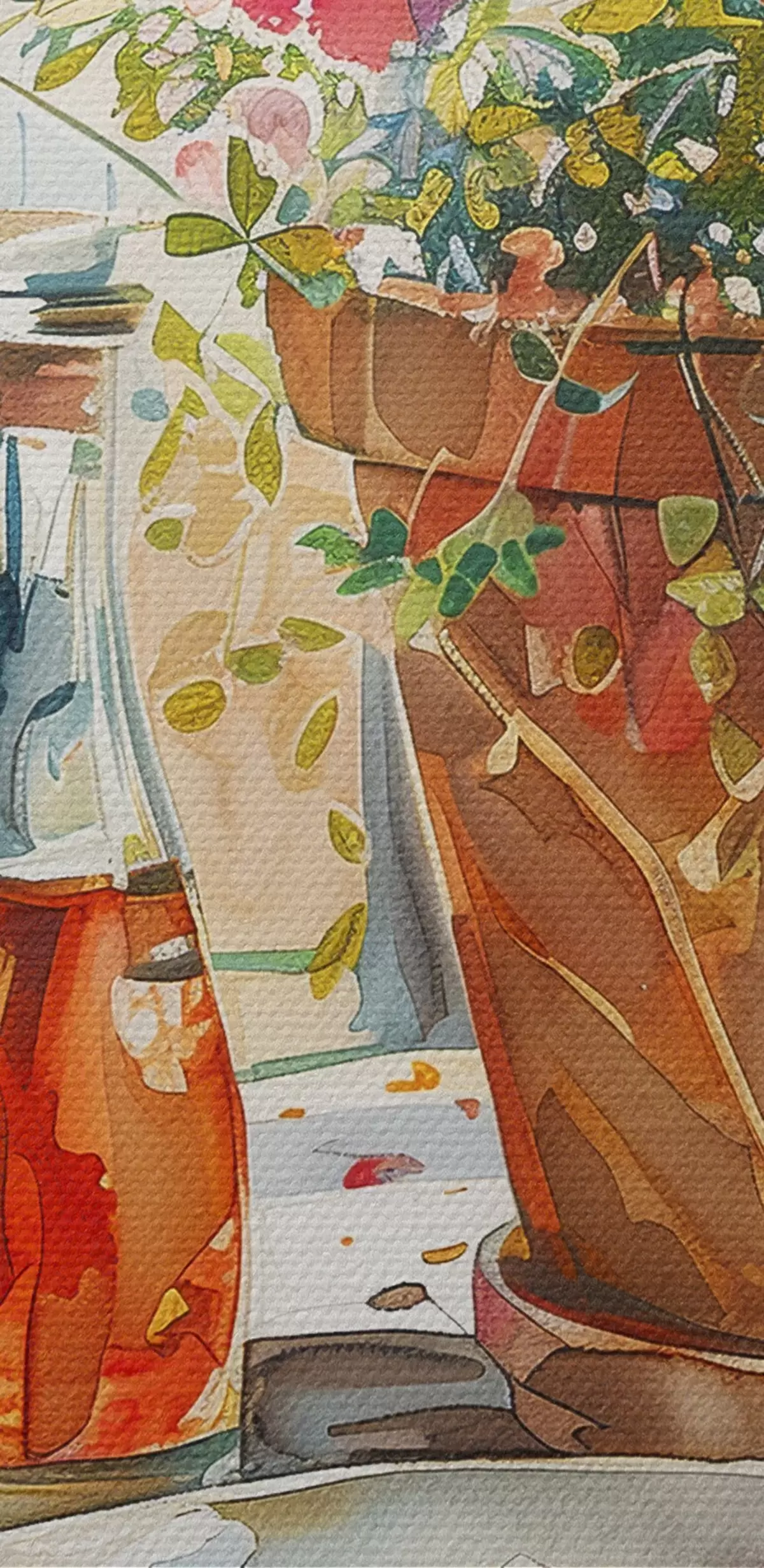 Kép Akvarell ág rizottóval, napfény az ablakban, pohár koktél, virágcserép Nr r39706