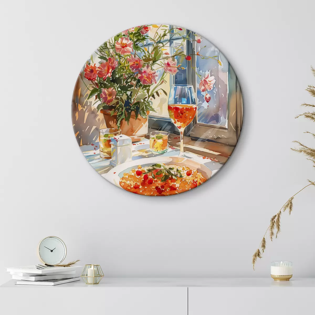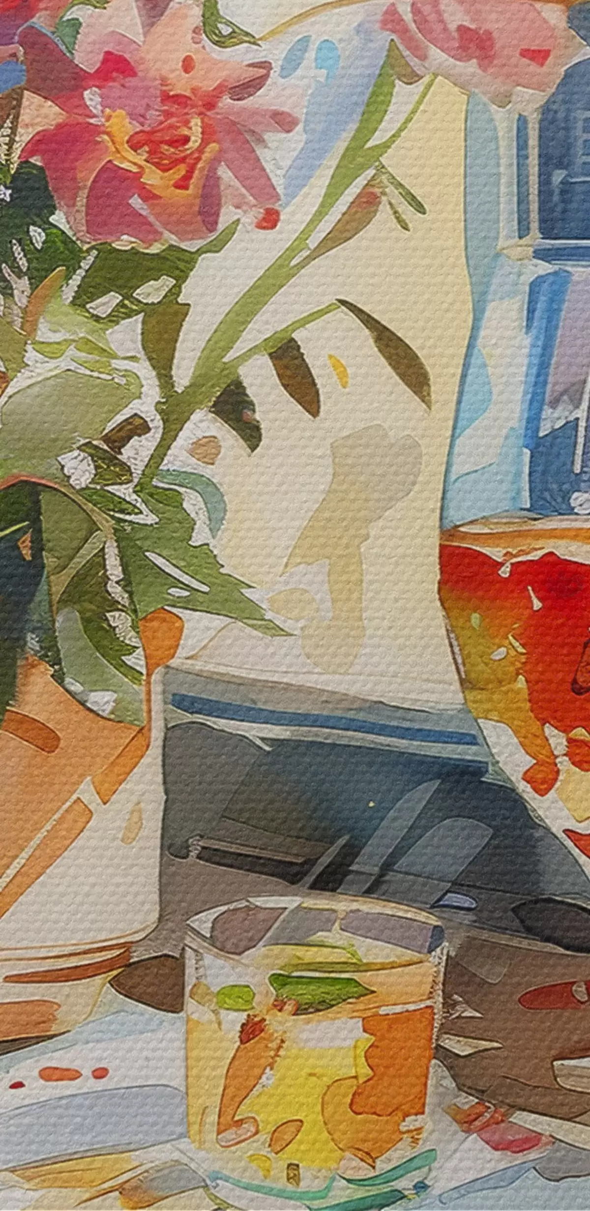 Kép Akvarell ág, napfény az ablakban, pohár koktél, nyári virágok Nr r39707