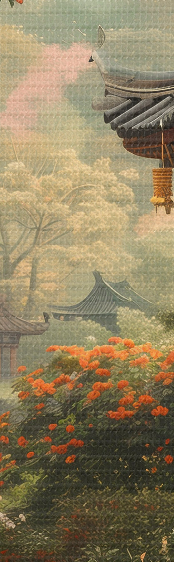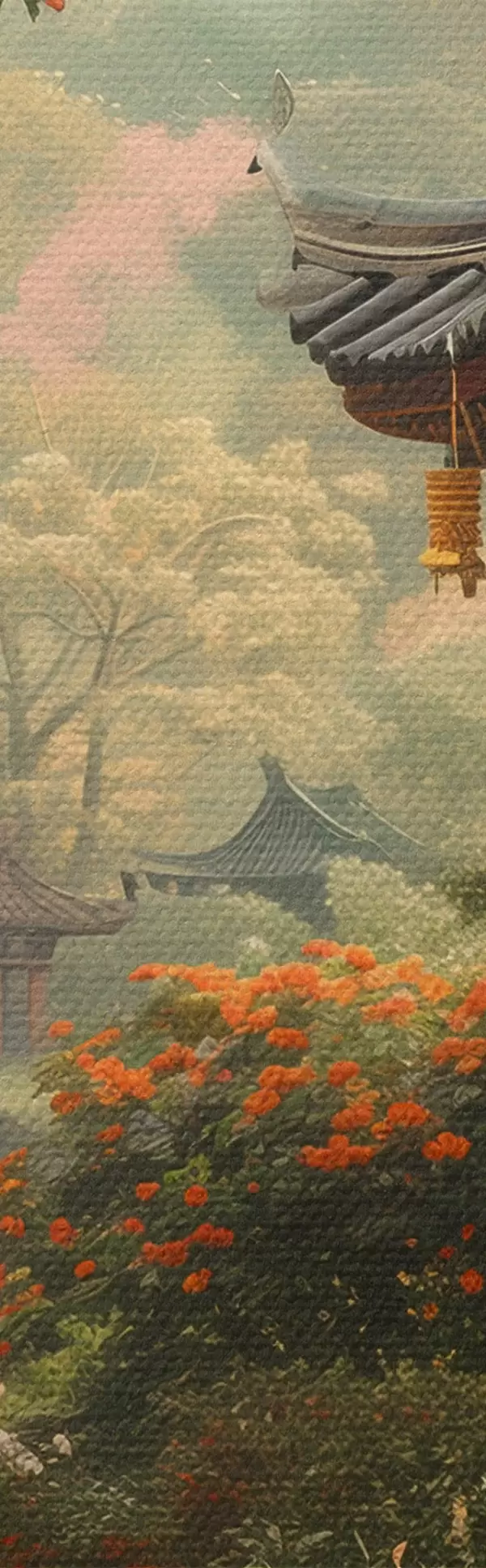Kép Japán park virágzó fákkal és virágokkal, erdővel, kertes házzal, tóval Nr r39772