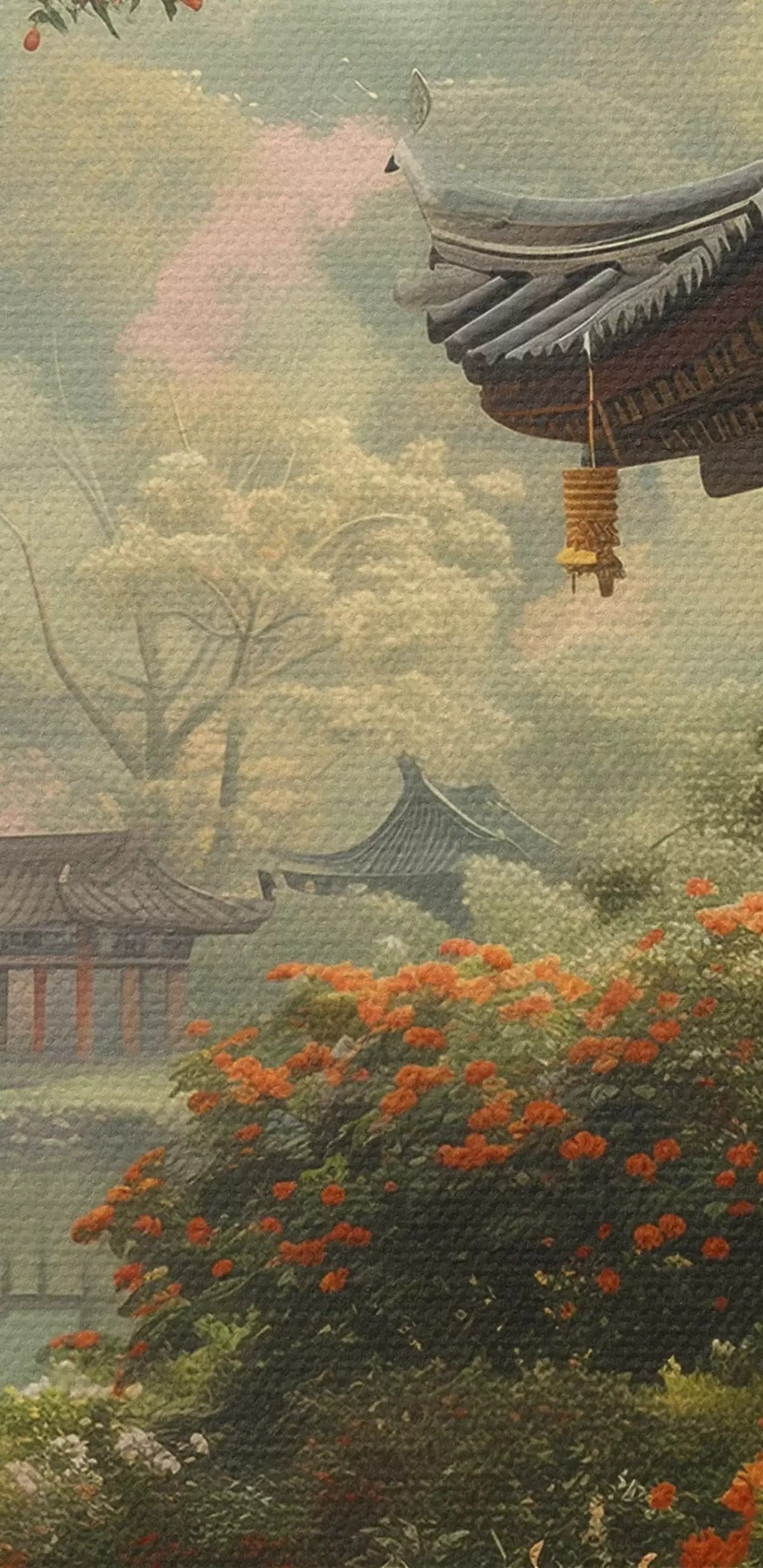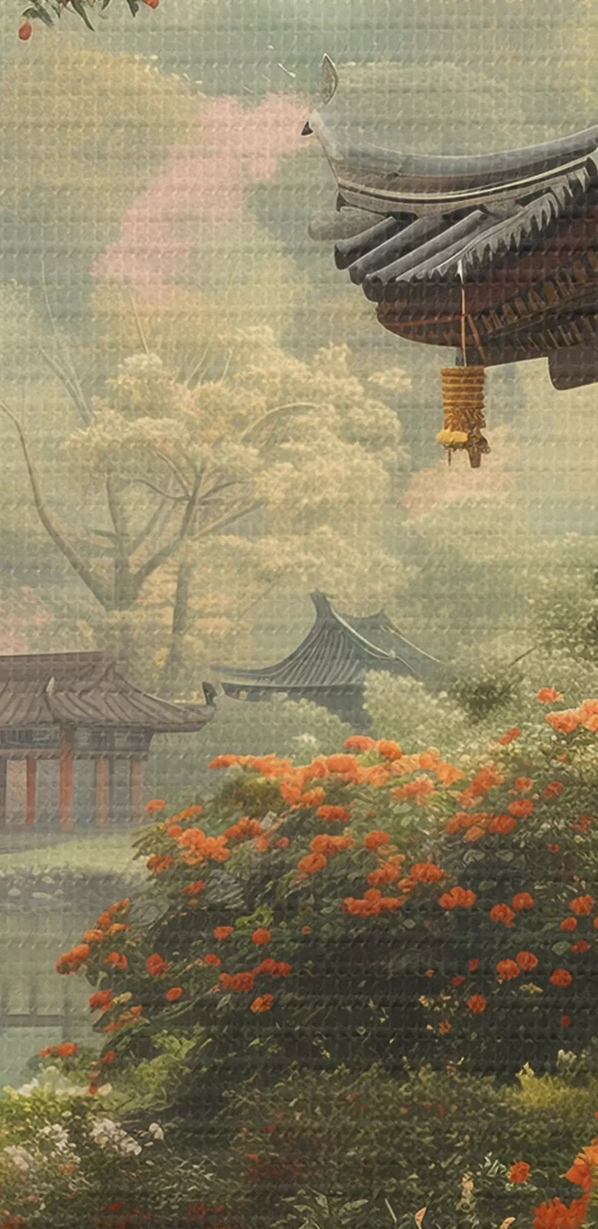 Kép Japán park virágzó fákkal és virágokkal, erdővel, kertes házzal, tóval Nr r39772