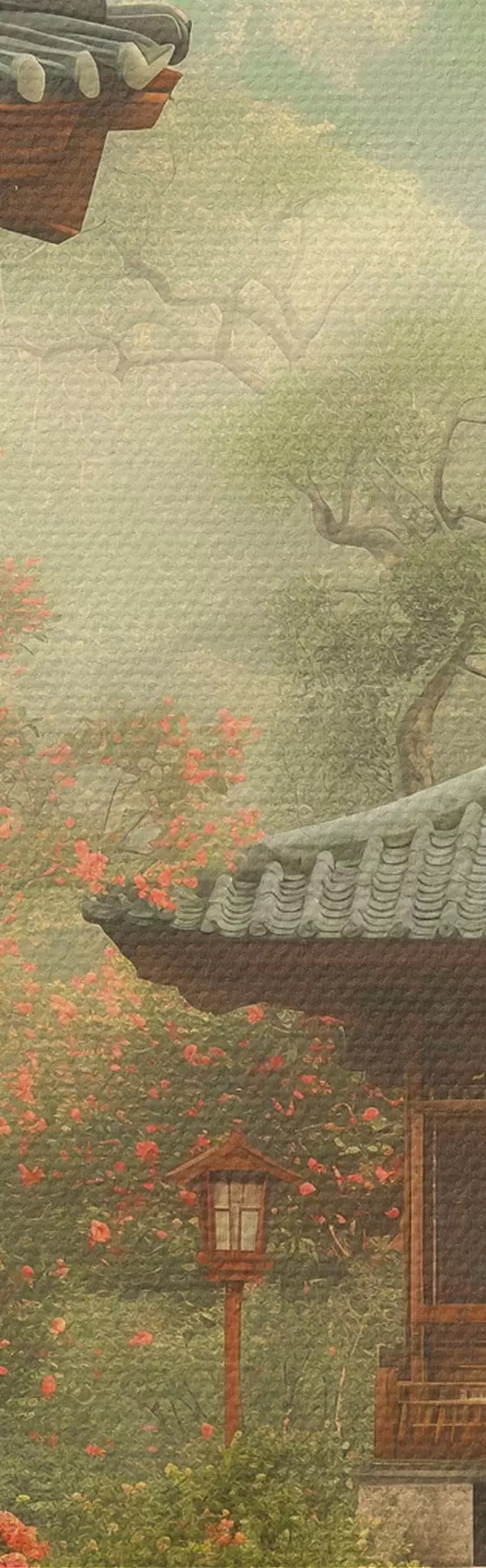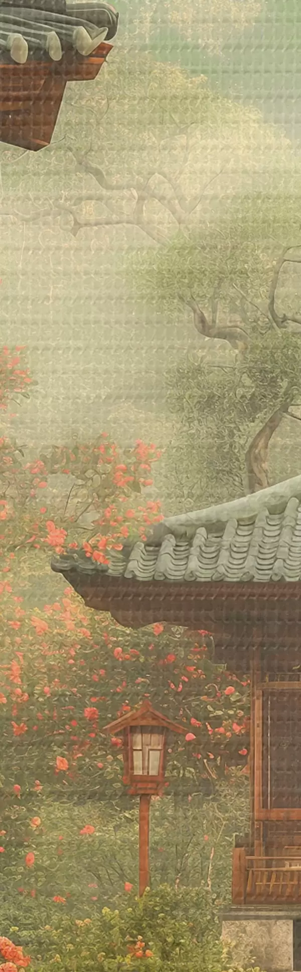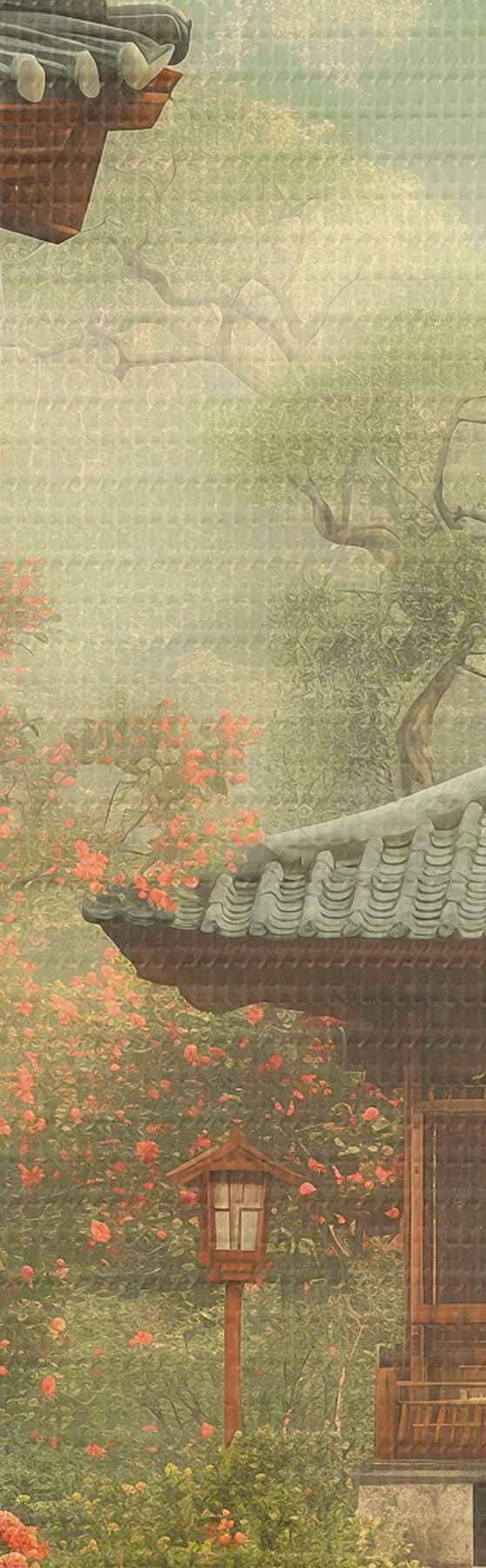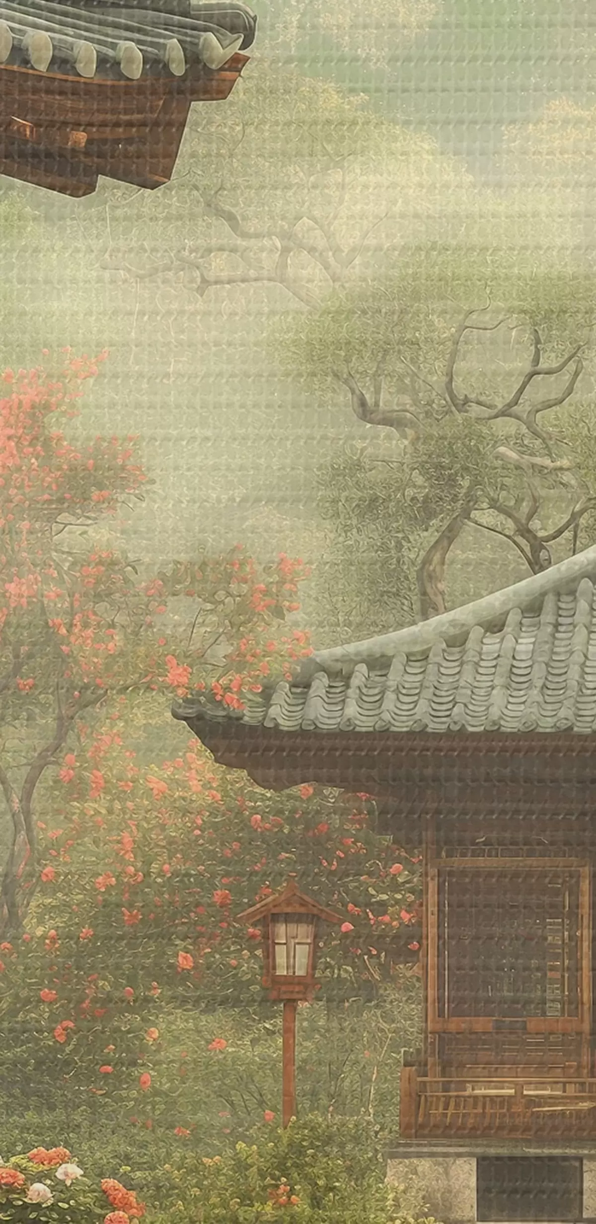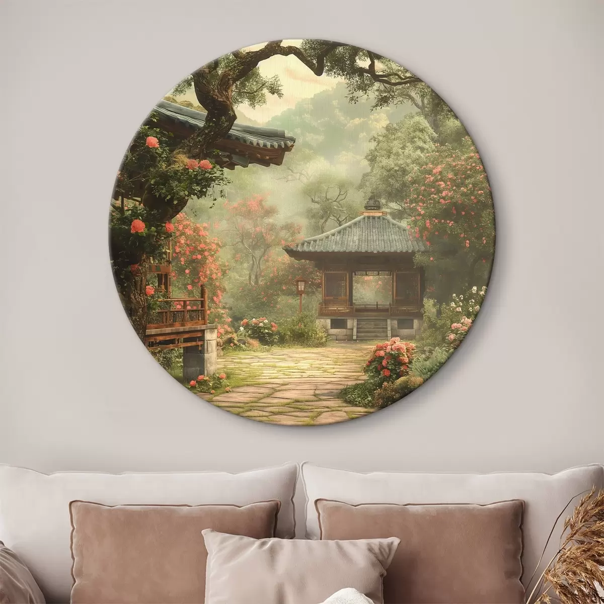 Kép Japán park virágzó fákkal és virágokkal, erdővel, faházzal Nr r39773