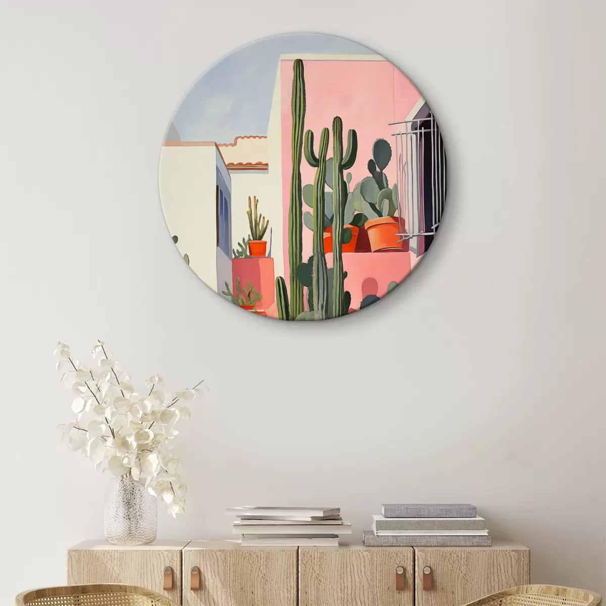 Kép Hosszú kaktuszok a háttérben egy rózsaszín ház és lépések olajfestmény Nr r39926