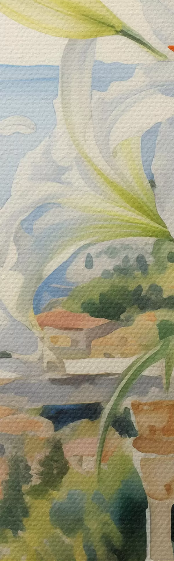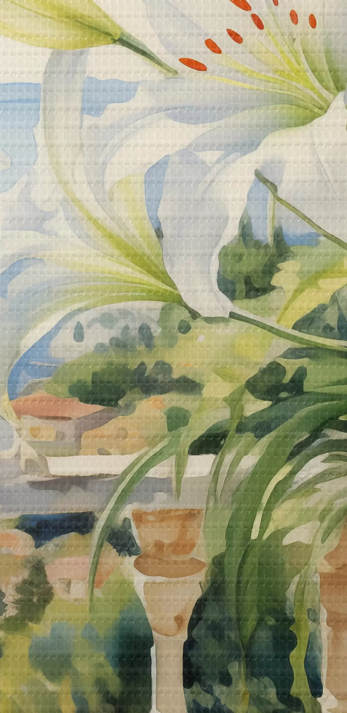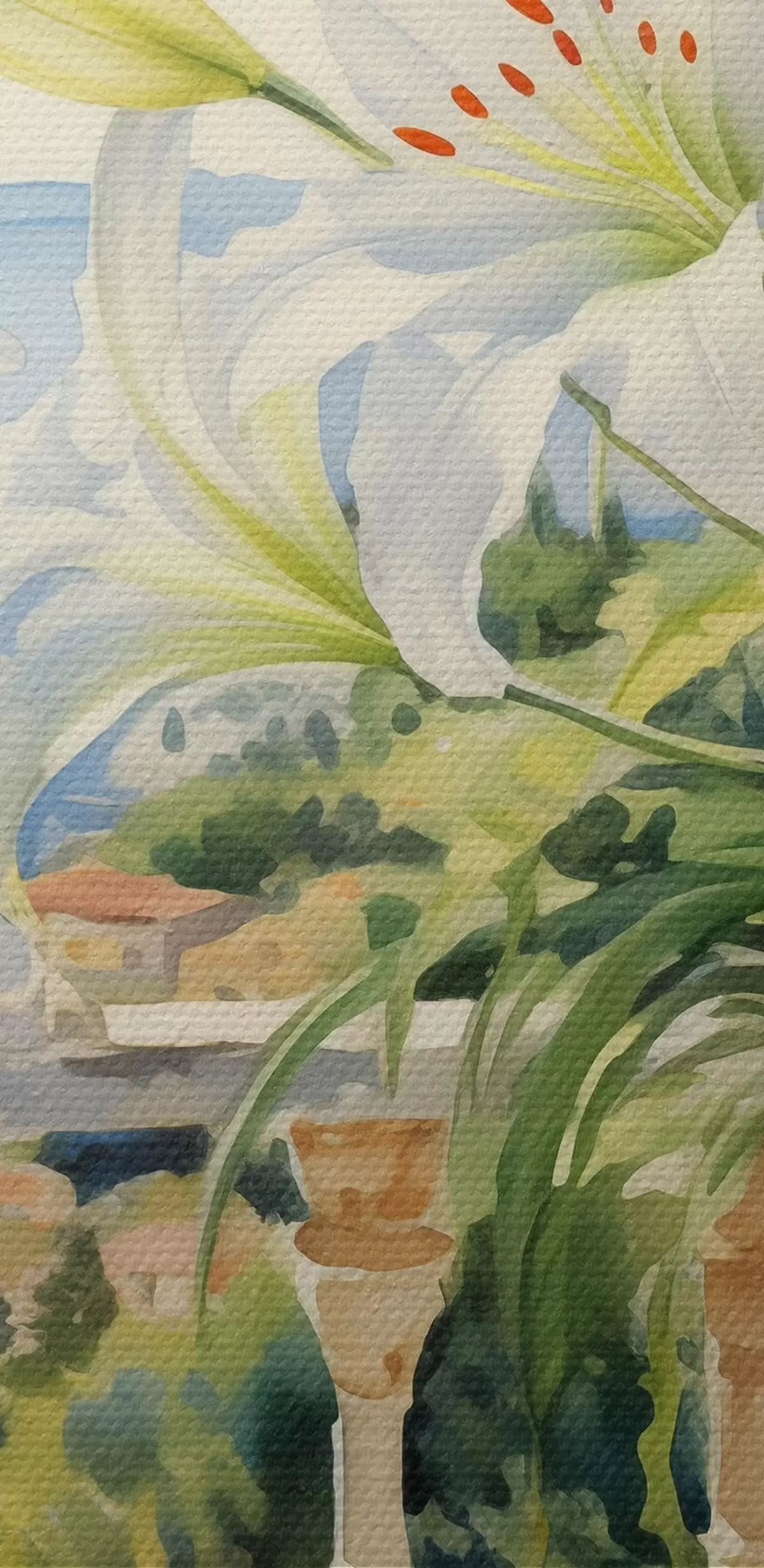Kép Fehér liliomok egy edényben az erkélyen, az öböl akvarell hátterében Nr r39932