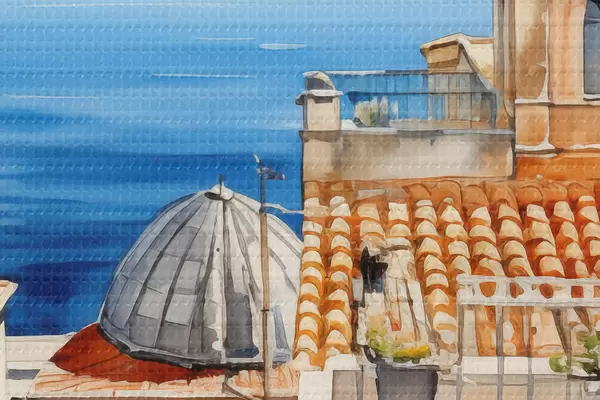 Kép Olasz házak tetői a tenger és az ég akvarell hátterében Nr r39933