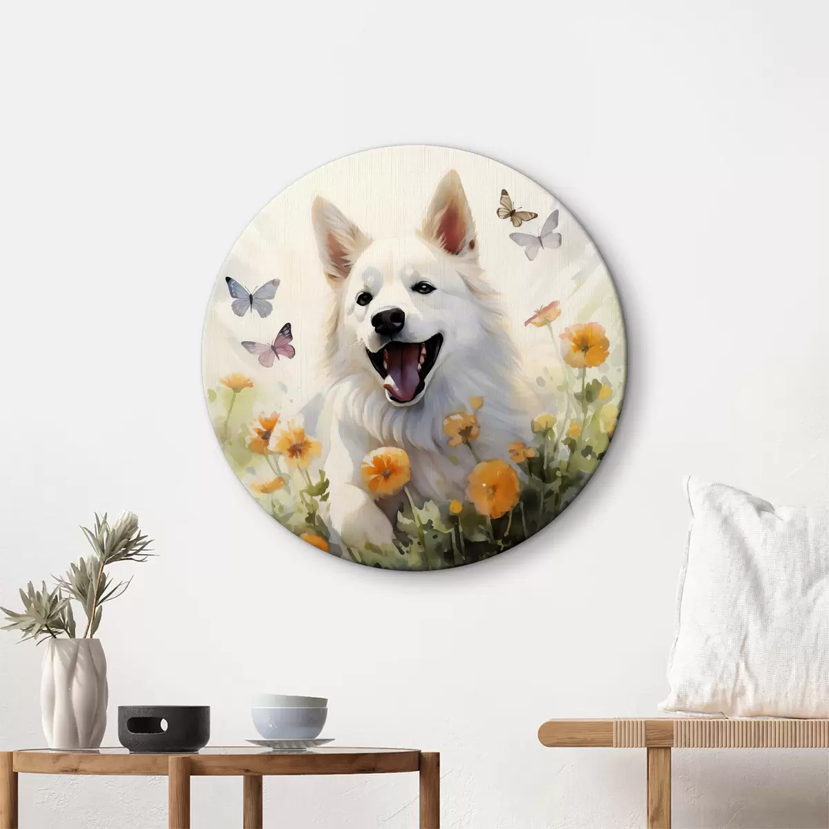 Kép Fehér kutya virágokban ül, pillangók repülnek akvarellben Nr r39936