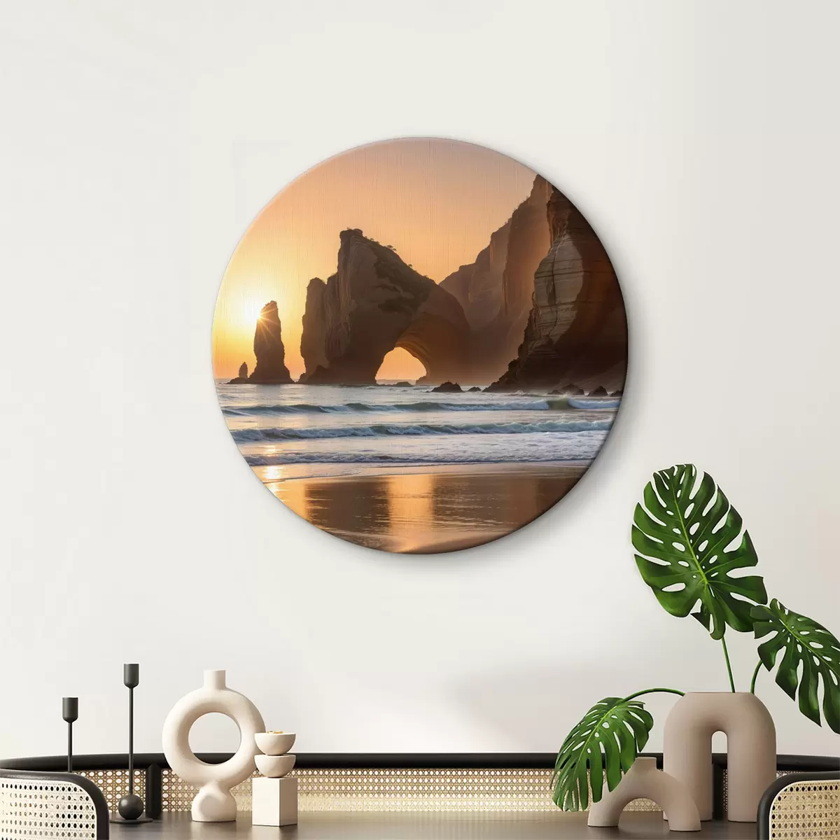 Kép Sziklás partvonal tengeri kazalokkal és boltívekkel naplementekor, hullámok összecsapásával a homokos tengerparton Nr r40025