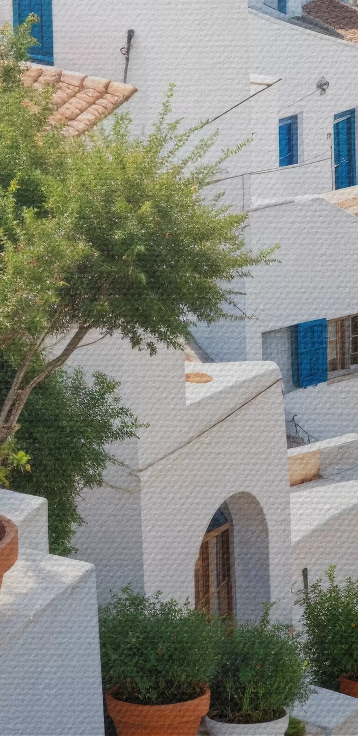 Kép Festői tengerparti város fehér épületekkel, kék ablakokkal és cserepes növényekkel a szűk utcákon Nr r40148