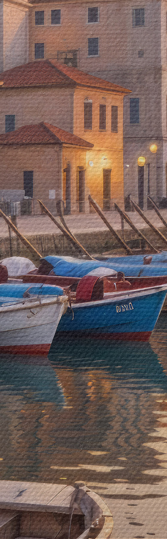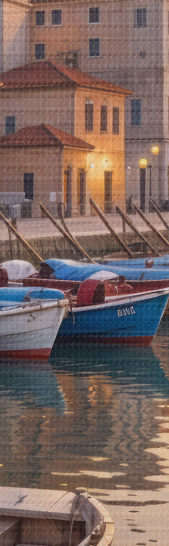 Kép Olasz tengerparti város naplementekor, színes épületekkel a vízparton és csónakokkal, amelyek a nyugodt vizeken úsznak Nr r40150