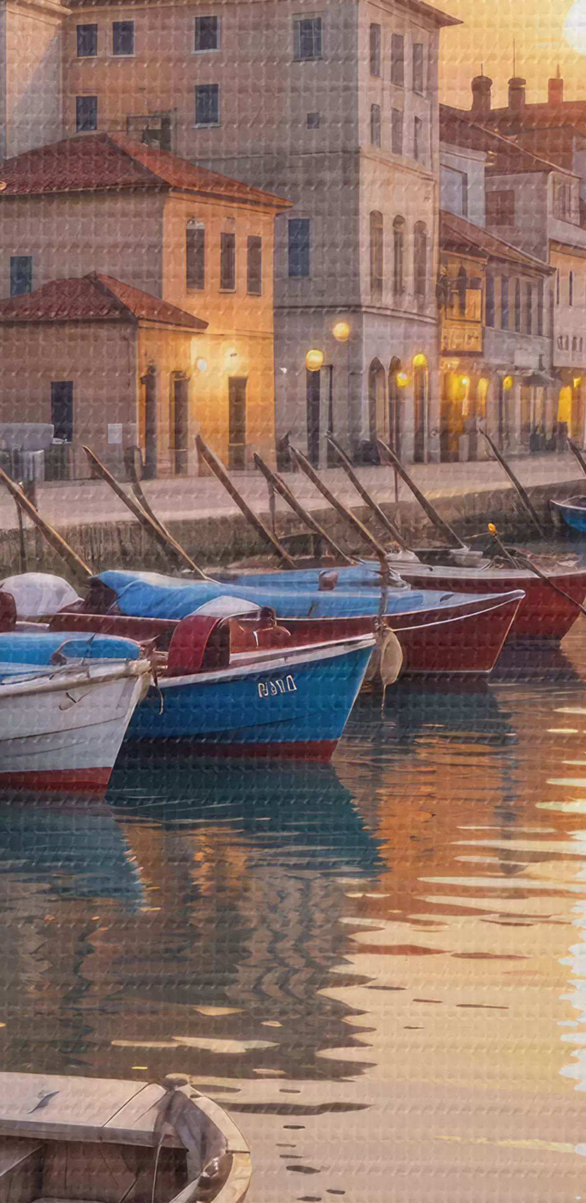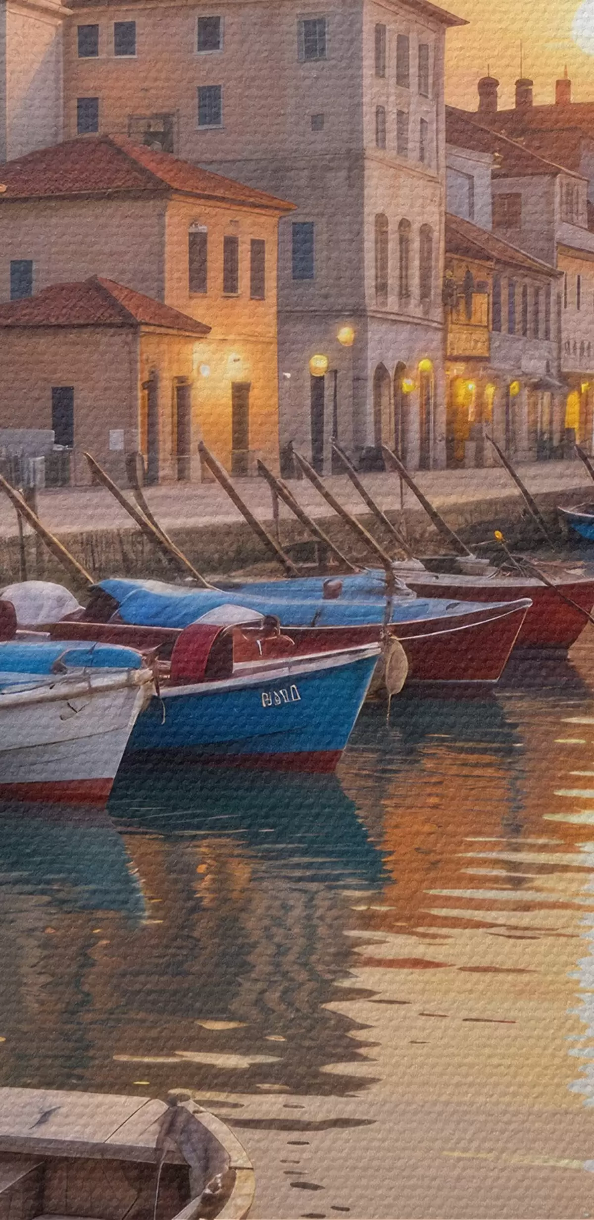 Kép Olasz tengerparti város naplementekor, színes épületekkel a vízparton és csónakokkal, amelyek a nyugodt vizeken úsznak Nr r40150