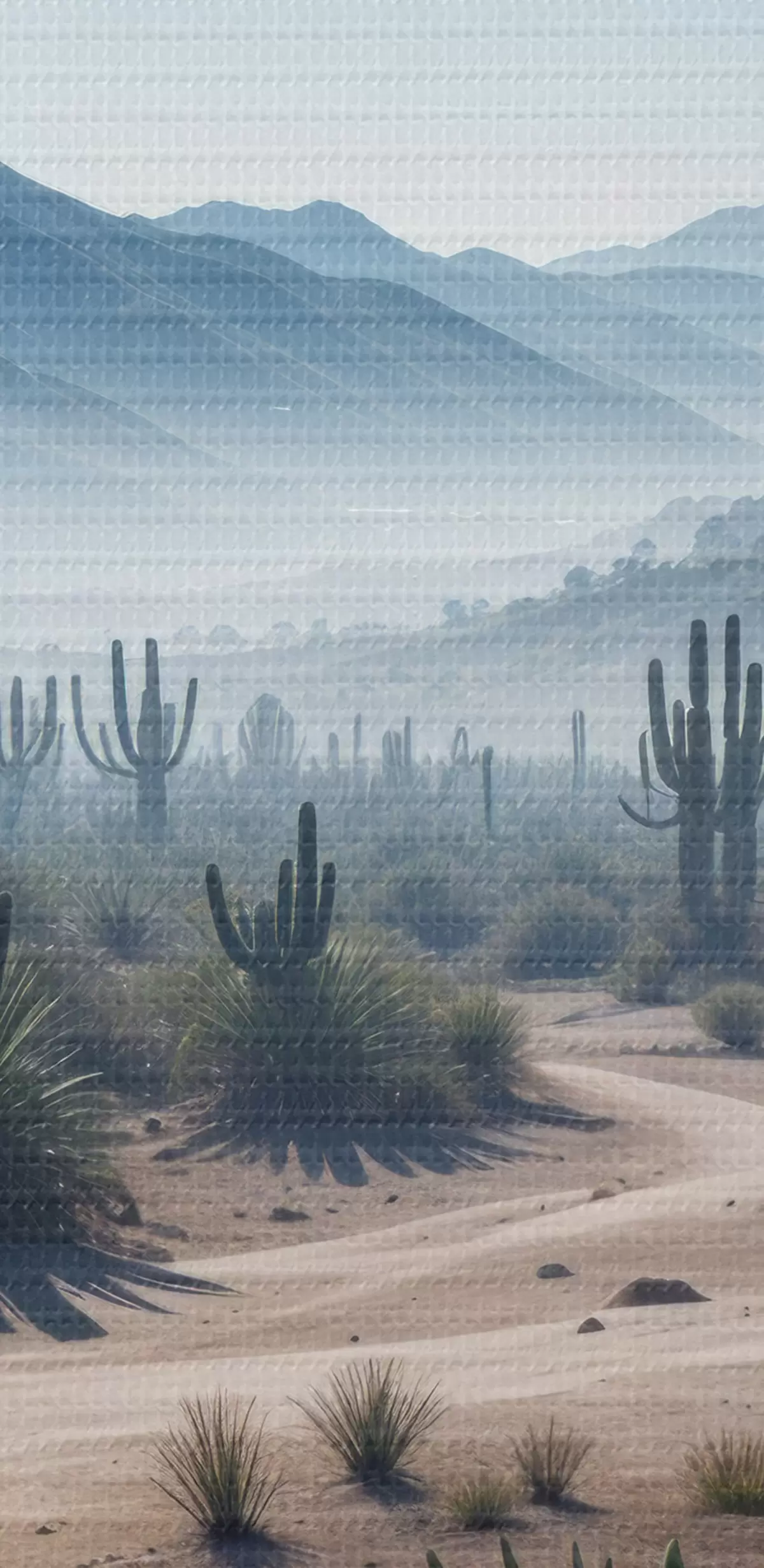 Kép Sivatagi táj magas kaktuszok és yucca növények az előtérben, ködös hegyekkel körülvéve Nr r40153