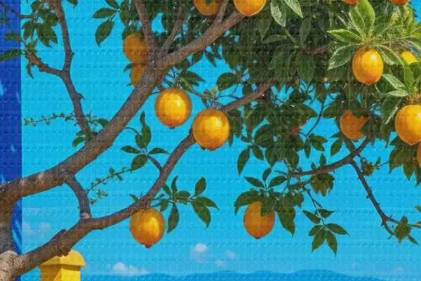Kép Egy narancsfa érett gyümölccsel egy kék falú és cseréptetős épületen, amely az óceánra néz Nr r40159