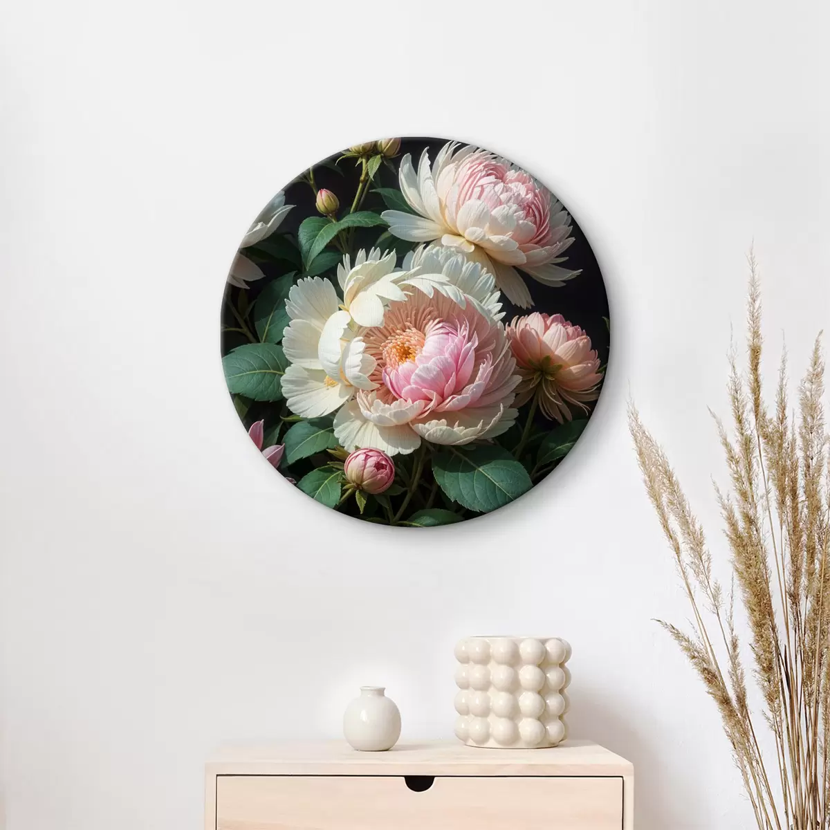 Kép Buja bazsarózsa virágok fehér, rózsaszín és sárga árnyalatokban, finom, réteges szirmokkal és zöld levelekkel Nr r40170