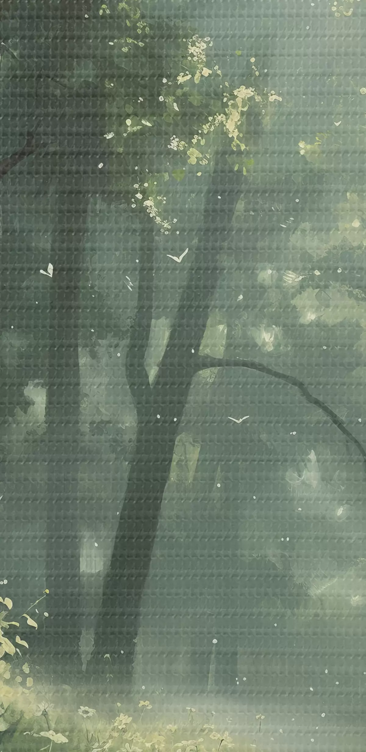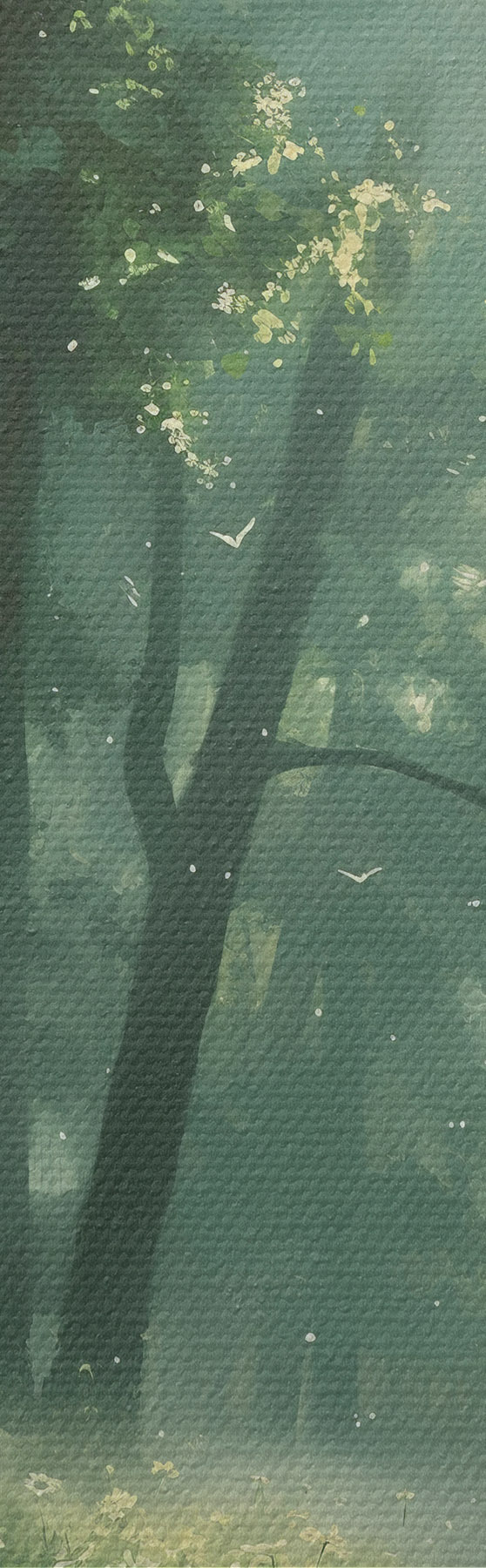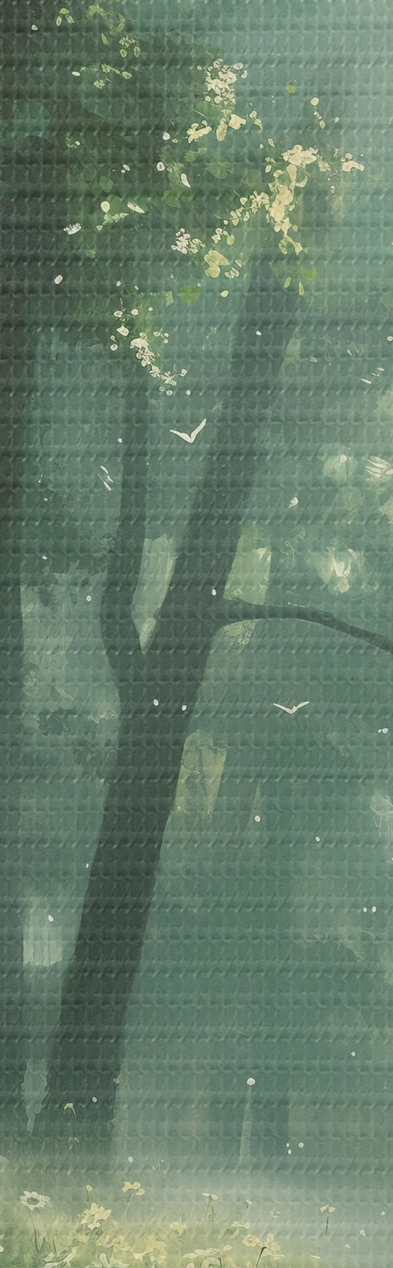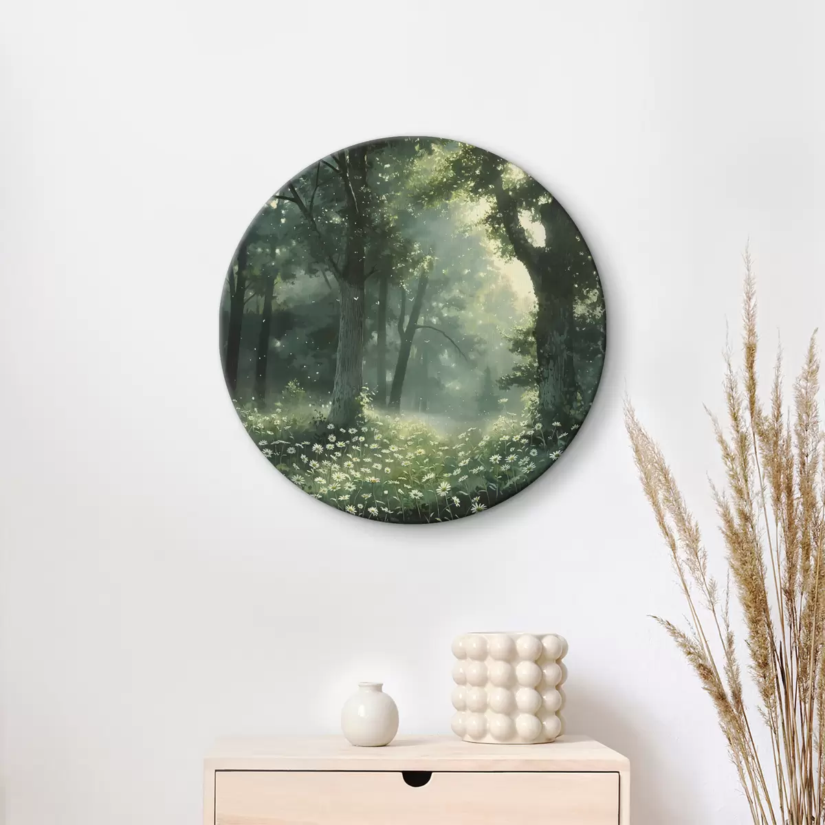 Kép Sűrű erdő napfény a fákon, kamilla virágok, zöld fű, természet Nr r40224