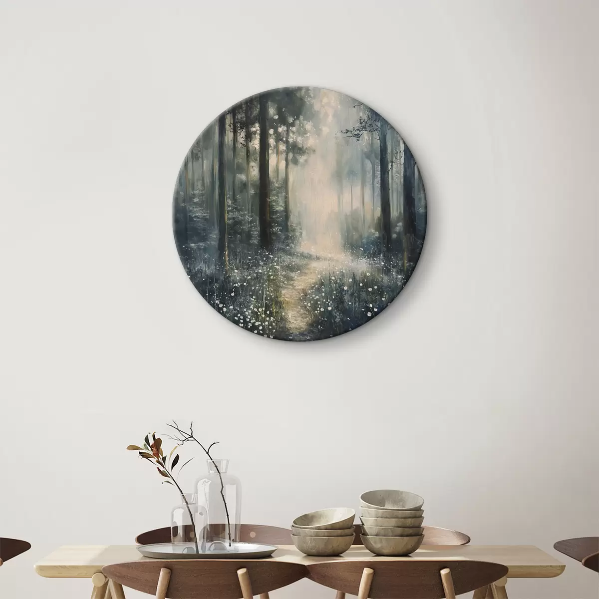 Kép Sűrű erdő napfény a fákon, fehér virágok, zöld fű, olajfestmény Nr r40227