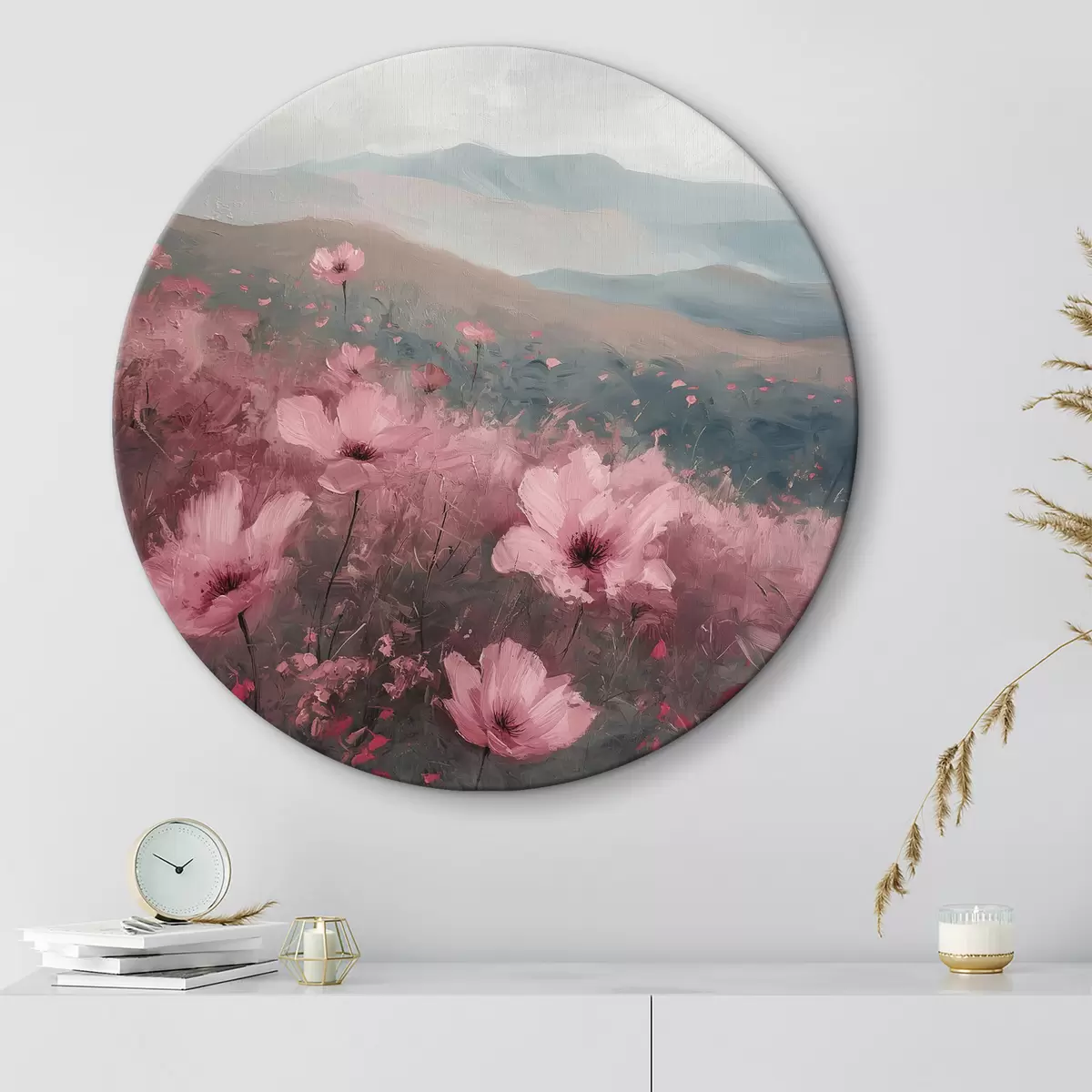 Kép Rózsaszín virágok a réten, természeti táj, hegyek, olajfestmény, élénk ecsetvonások Nr r40233