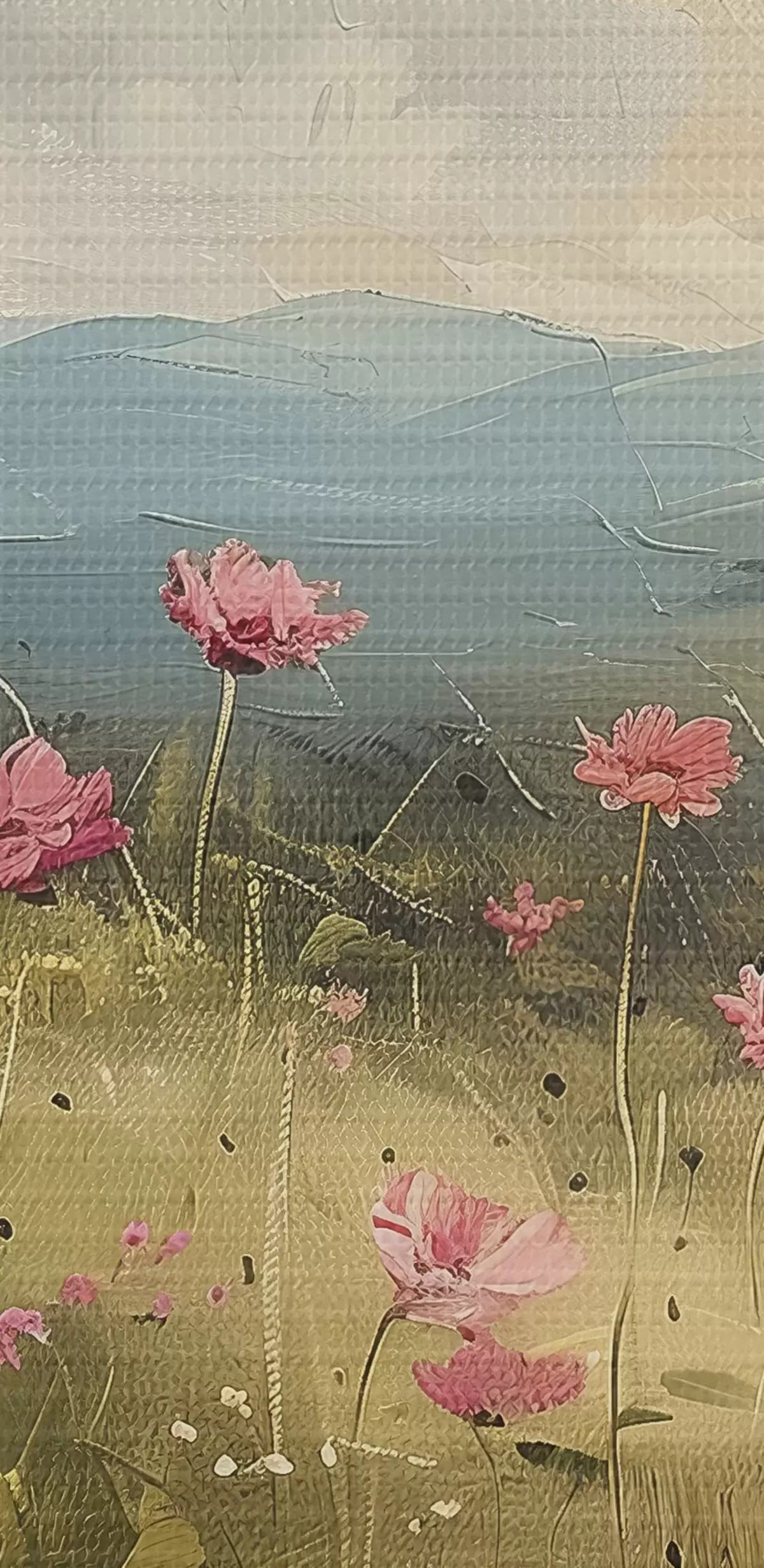Kép Rét rózsaszín virágokkal, zöld fűvel, természeti tájjal, felhőkkel, akril rajzzal Nr r40234