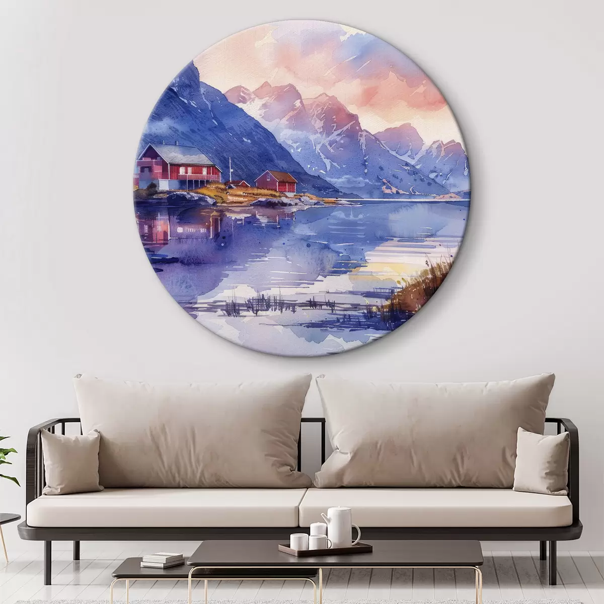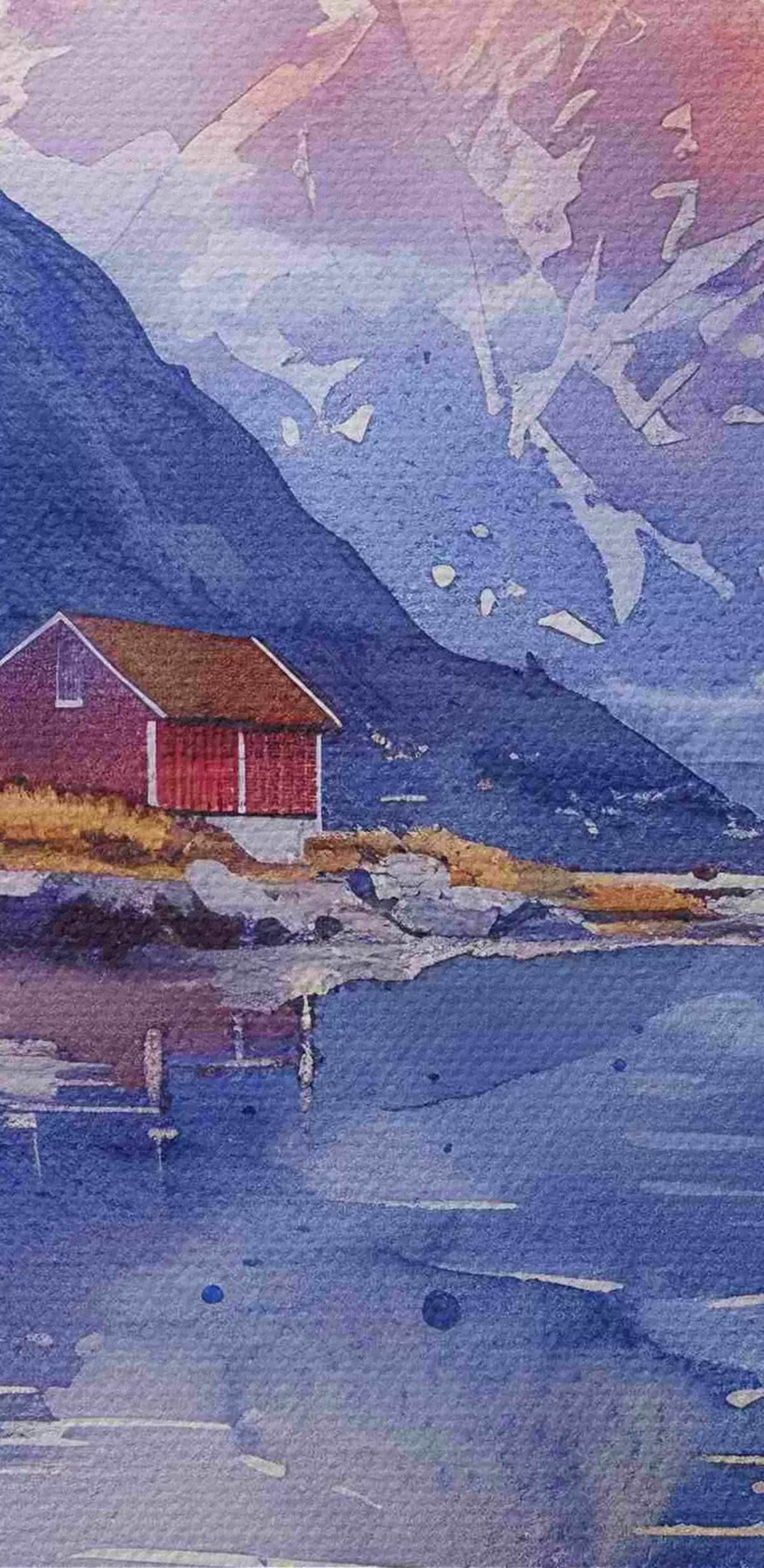 Kép Norvég falu, naplemente, nyugodt folyó, hegyek, akvarell, vízfestmény Nr r40311