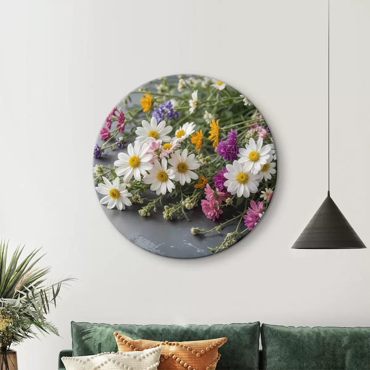 Kép Egy csokor színes vadvirágokból százszorszépeket, pitypangokat és rózsaszín virágokat szürke alapon Nr r40389