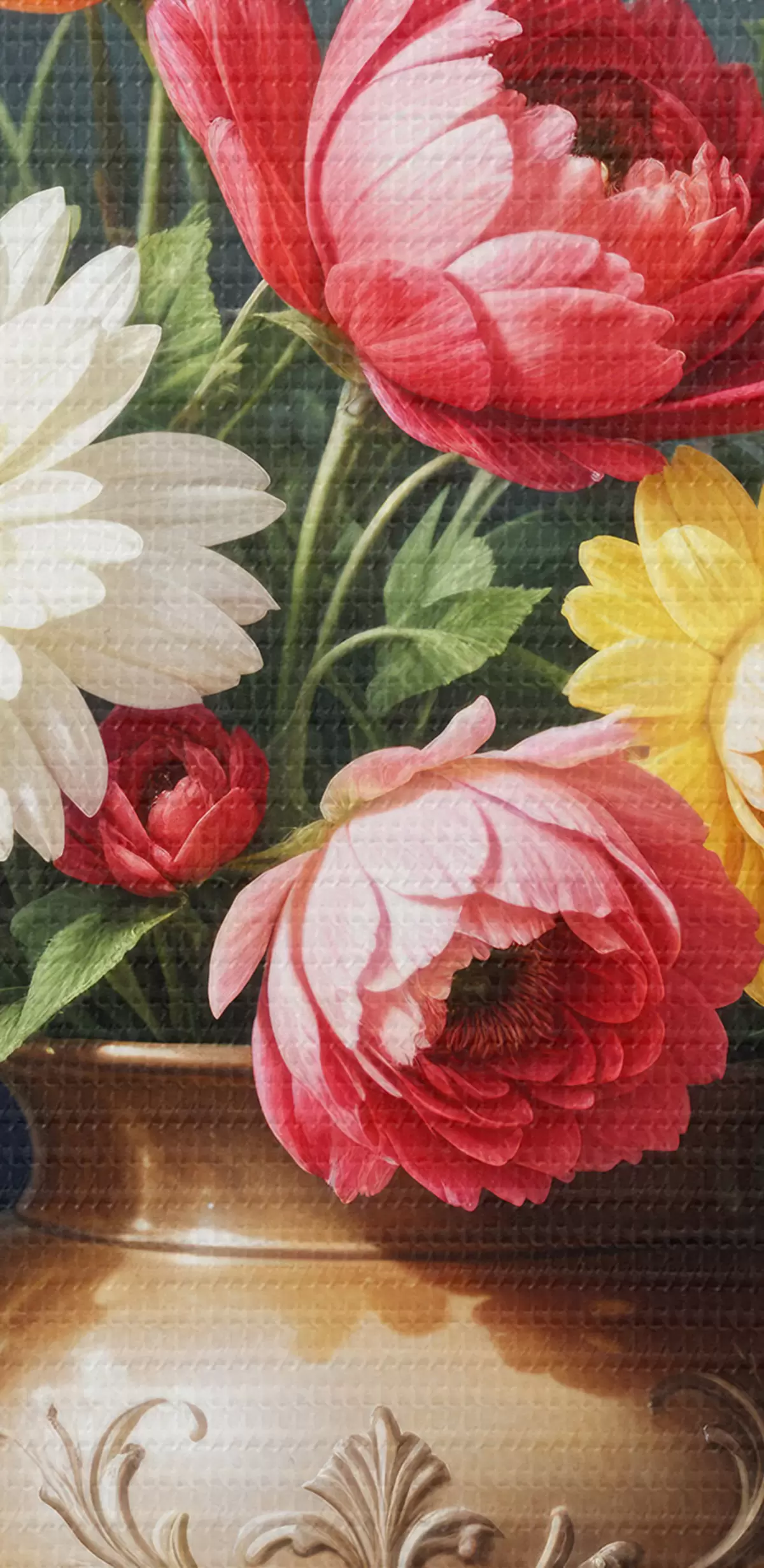 Kép Egy élénk festmény egy csokor színes virágokról, köztük vörös rózsákról, sárga nárciszokról és fehér százszorszépekről Nr r40395
