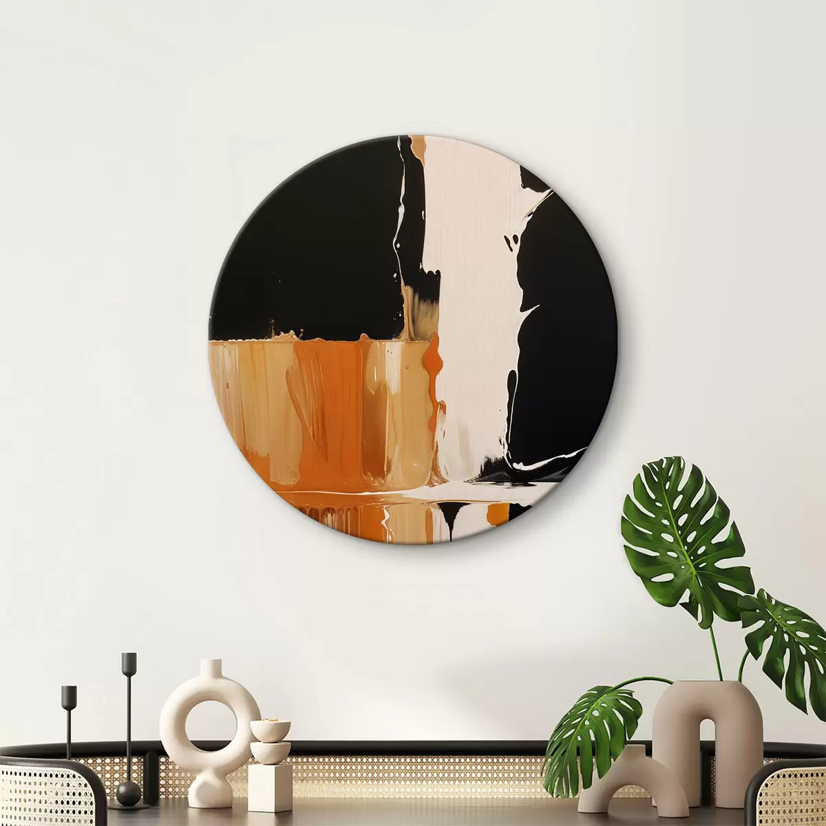 Kép Sötét absztrakt festmény fekete, narancssárga és fehér merész ecsetvonásokkal Nr r40402
