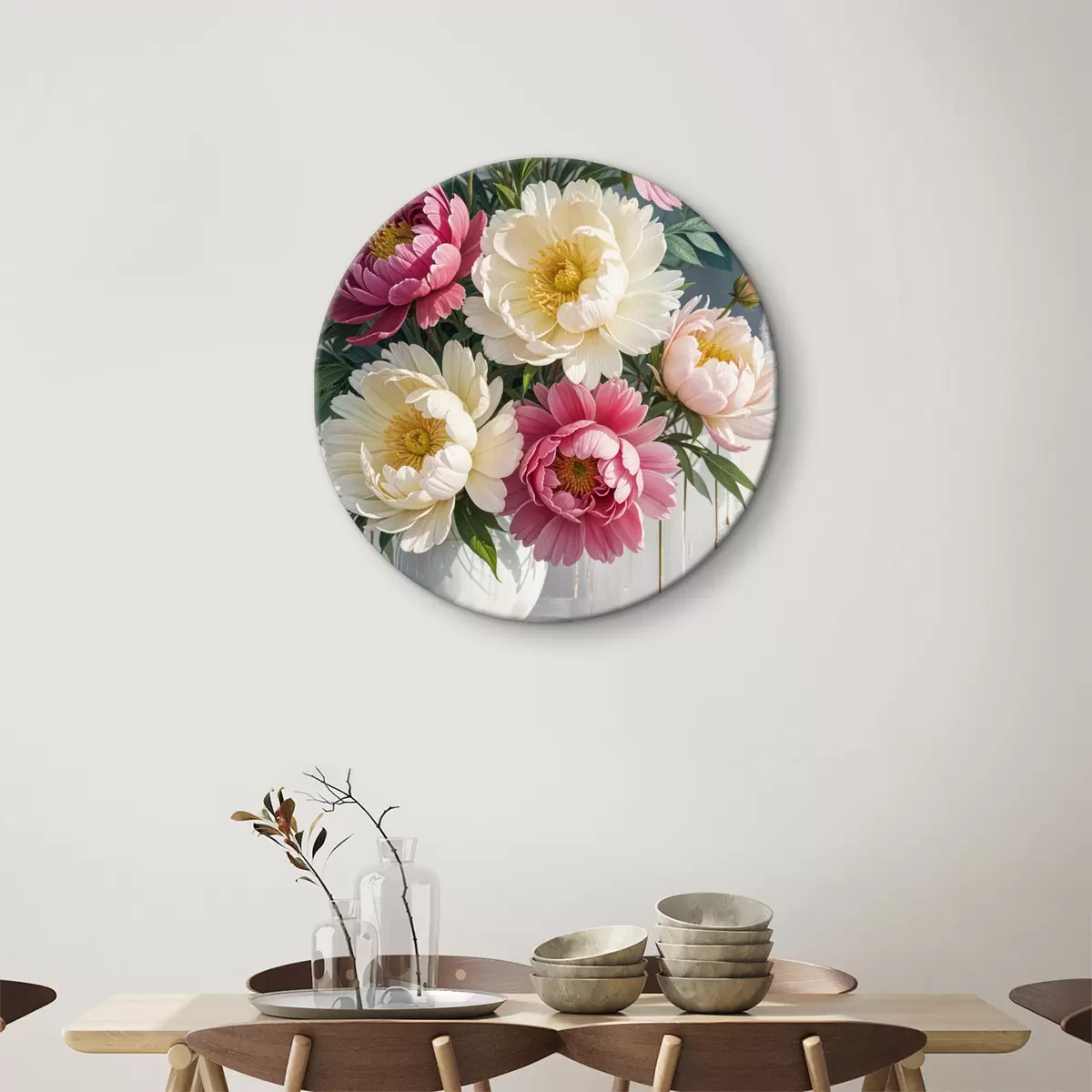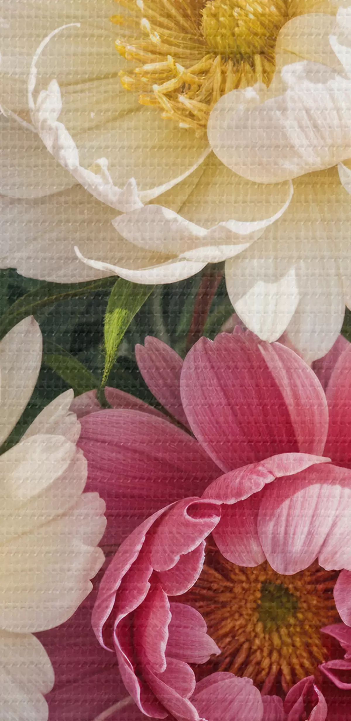 Kép Egy csokor élénk bazsarózsa virágokból, rózsaszín, fehér és sárga különböző árnyalataiban, festékfoltokkal Nr r40403