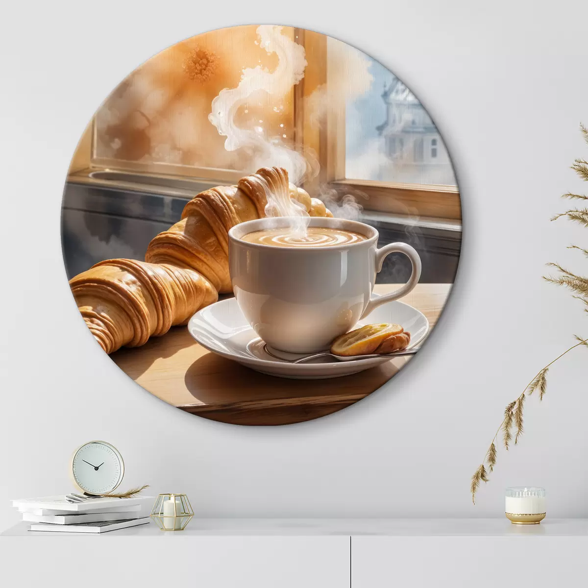 Kép Egy meleg csésze kávé felszálló gőzzel, egy asztalon egy croissant mellett, kilátással egy történelmi épületre Nr r40405