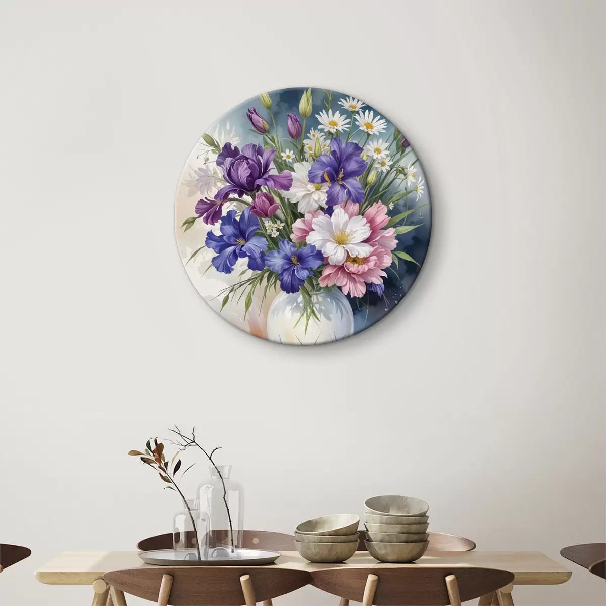 Kép Élénk csokor színes lila íriszekből, rózsaszín százszorszépekből és más virágokból, fehér vázába rendezve Nr r40407