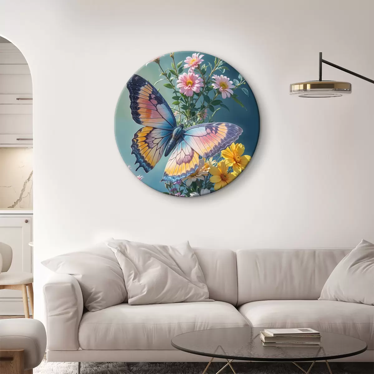 Kép Egy nagy, színes pillangó egy rózsaszín és sárga virágcsokoron ült, sötétzöld háttér előtt Nr r40411