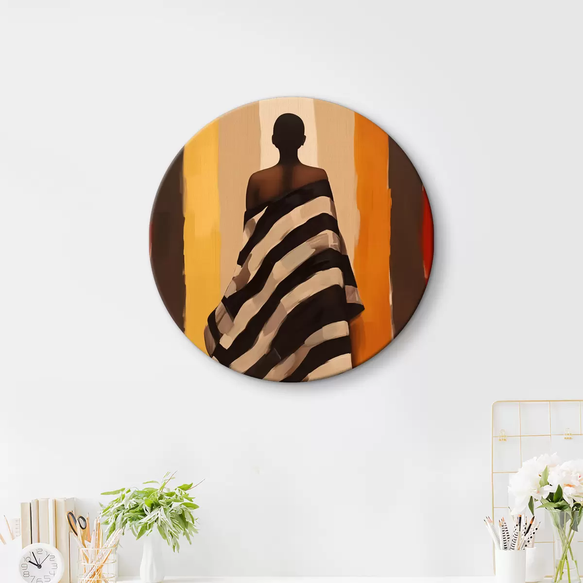 Kép Egy afroamerikai nő sziluettje csíkos köpenyben, a háttérben függőleges csíkokkal, fekete, bézs, sárga, piros, barna Nr r40487