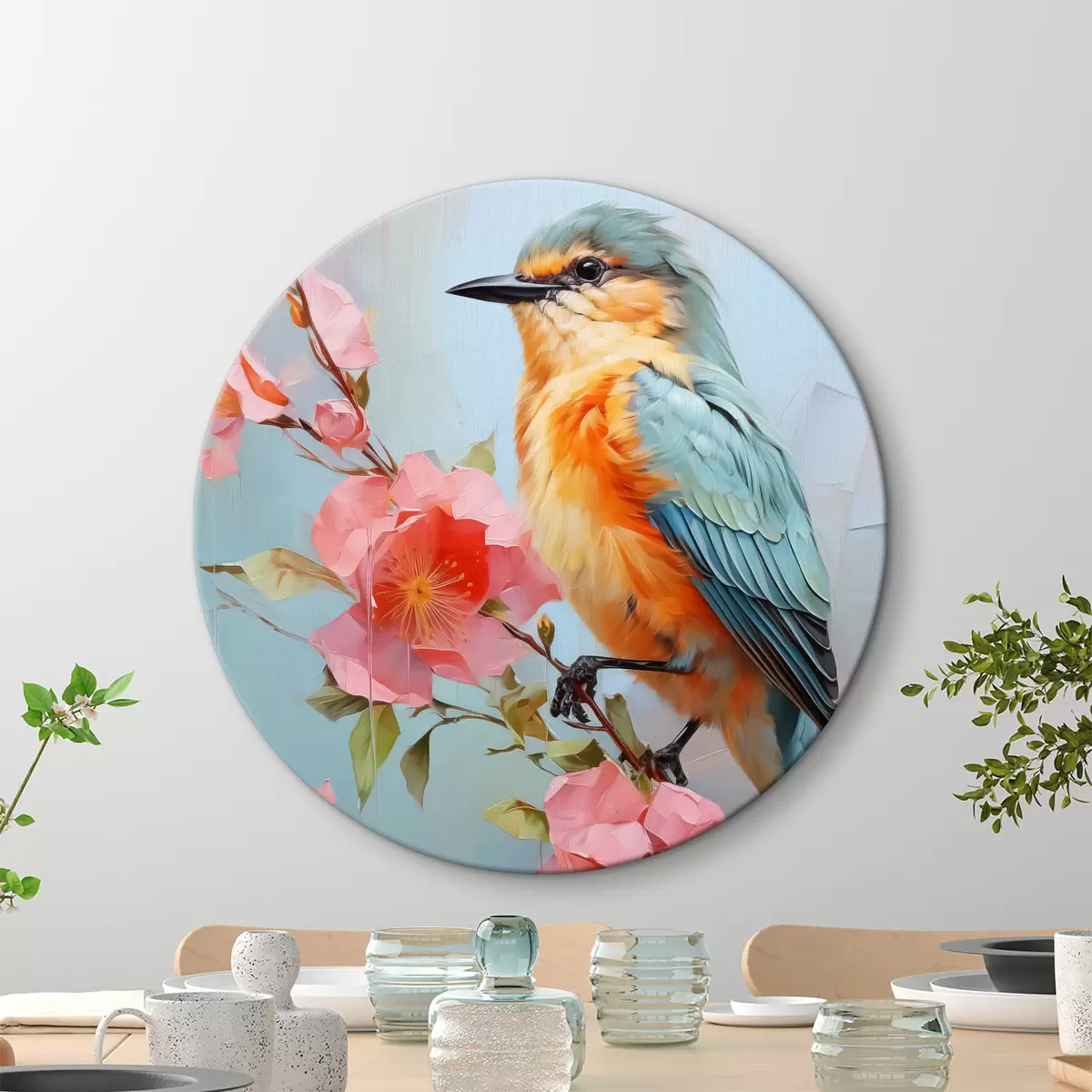 Kép Madár ül egy ágon, virágzó virágokkal, kék, rózsaszín, piros, narancssárga, sárga színű Nr r40489